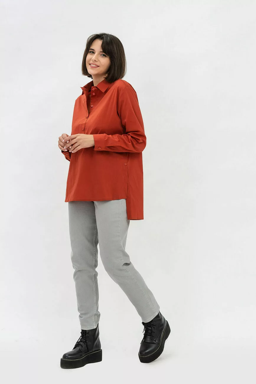 Розбавте будні соковитою теракотовою блузою жіночою оригінального крою! Тканина виробу – однотонний сатин. Крій прямий, з розрізами по боках. Рукави довгі, спущені від лінії плечей. Внизу доповнені манжетами із застібкою на ґудзики. Цікаве рішення – відкладний комір та ґудзики на центральній планці до лінії талії. Спинка блузки подовжена. Виділяйтесь за допомогою оригінальних моделей від нашого бренду!