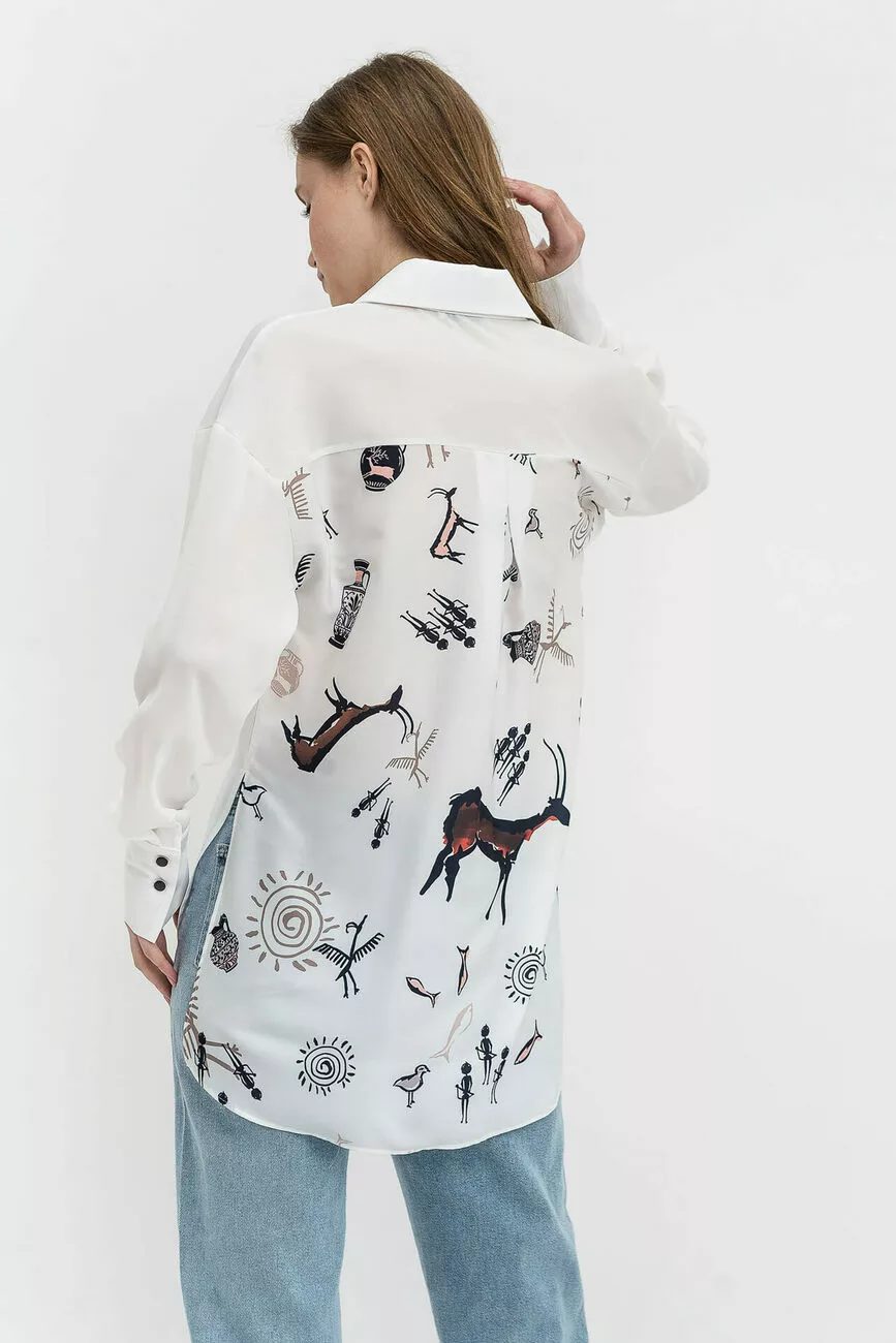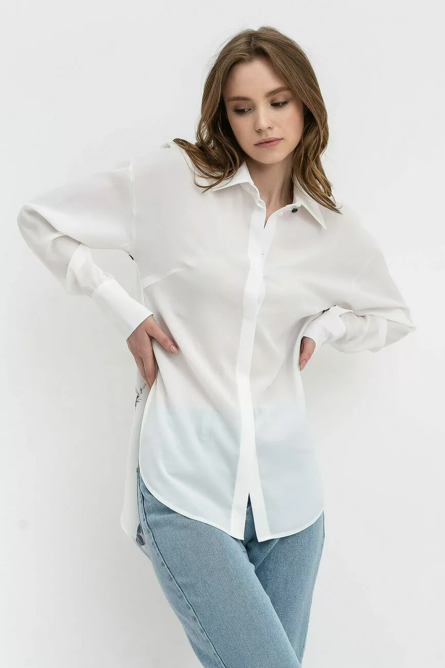 На перший погляд – це класична біла жіноча блуза, проте її особливість – у принтованій спинці, яка покращує модель, робить її не такою повсякденною і звичною. Завдяки такому рішенню цілісний образ в одязі сприймається свіжо та стильно. Модель має прямий силует, виложистий комір на стійці, довгі рукави з манжетами та приховану застібку на ґудзиках. Цю блузку та інший елегантний жіночий одяг ви завжди можете замовити на сайті бренду LESIA!