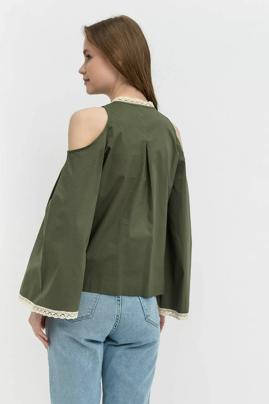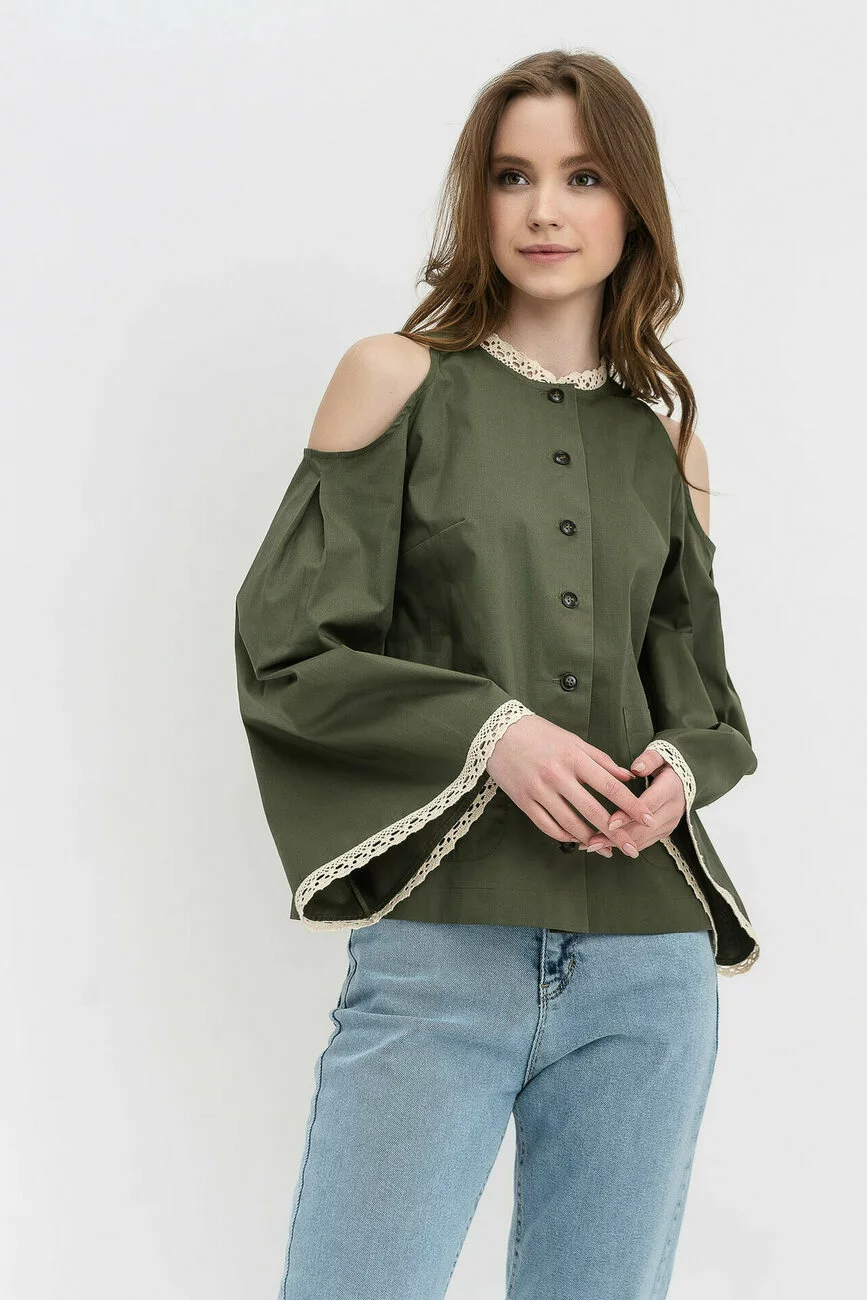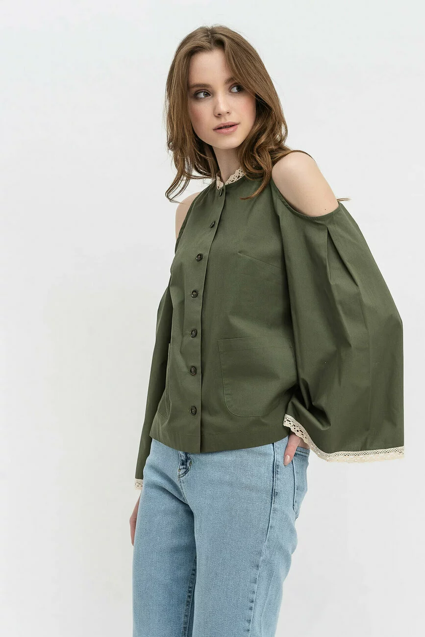 Сорочка має вільний силует, довгі рукави-кльош з відкритими плечами і накладні кишені попереду. Насичений колір хакі виробу робить цю жіночу блузу більш помітною, а світле мереживо, яке прикрашає рукави та горловину, додає м’якості та ніжності моделі. Застібається сорочка попереду на ґудзики. Дивуйте та захоплюйте своїми оригінальними образами оточуючих! А наш сайт одягу вам допоможе з вибором цікавих речей.