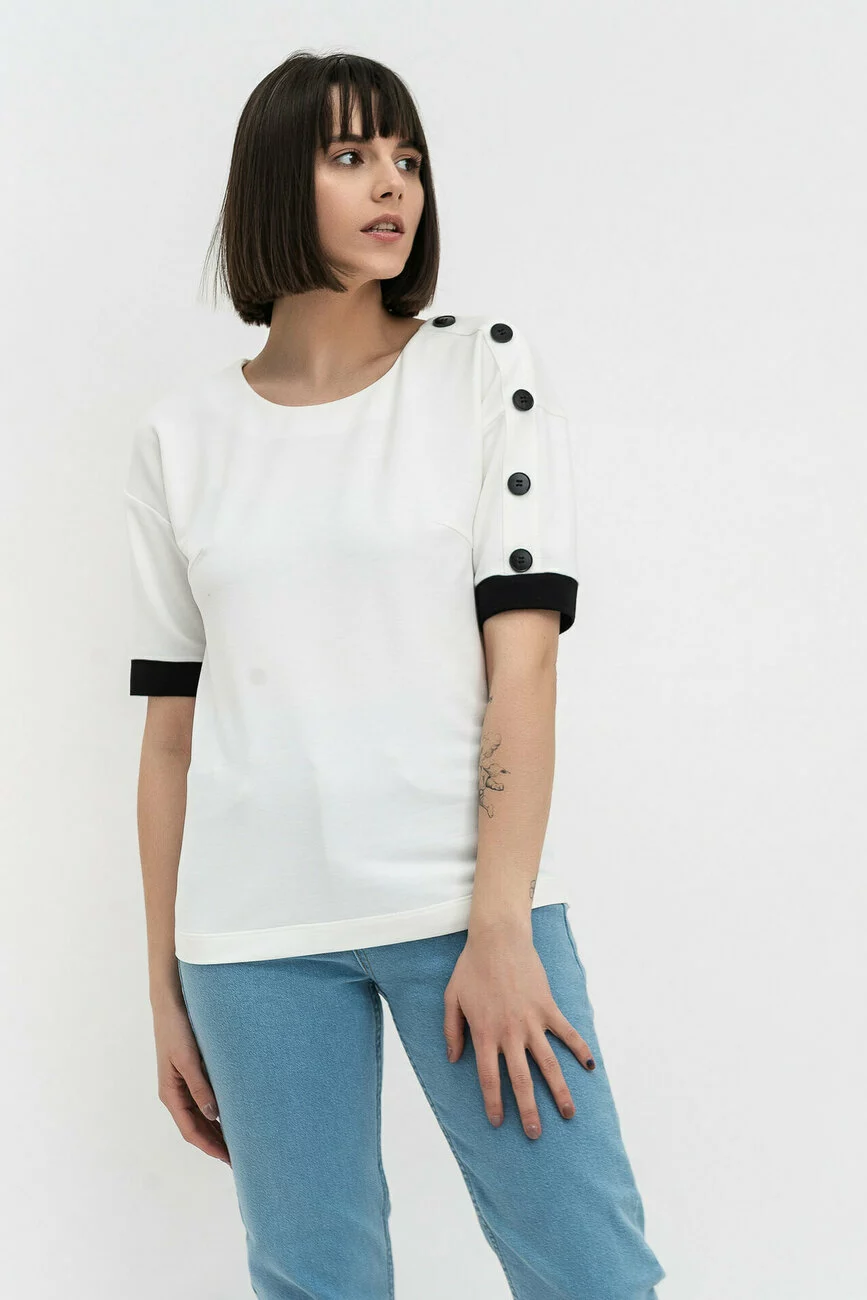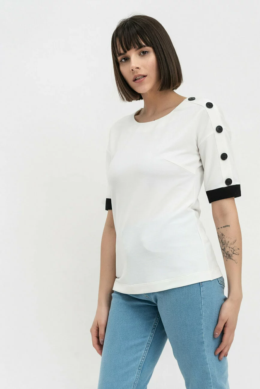 Напівприталений силует граціозно облягає струнку фігуру. По лівому по плечовому шву розміщується планка з гудзиками контрастного кольору. Рукав до ліктя з манжетою відкриває красиву лінію жіночої руки. Щоб підкреслити талію, використовується в комплекті пояс, вільна частина якого опускається вниз, демонструючи фривольний настрій своєї господині і незгоду із суворим, офісним стилем. Така блуза обов'язково повинна бути в арсеналі сучасної модниці!