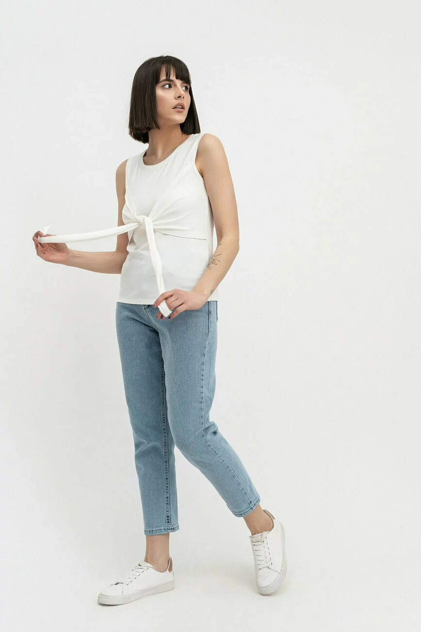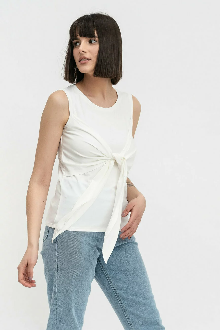 Родзинка цієї блузи – декоративні деталі попереду, які переходять у зав’язки. Завдяки ним простий фасон моделі виглядає по-новому і робить її помітною в ансамблі з брюками чи спідницею. Дві різні тканини – трикотаж і масло – додають фактурності, а круглий виріз горловини підкреслює красиві вигини шиї. Ця блуза та інший стильний одяг для жінок продається в інтернет-магазині LESIA. Оновіть свій гардероб для нових сезонів якісним, модним одягом!