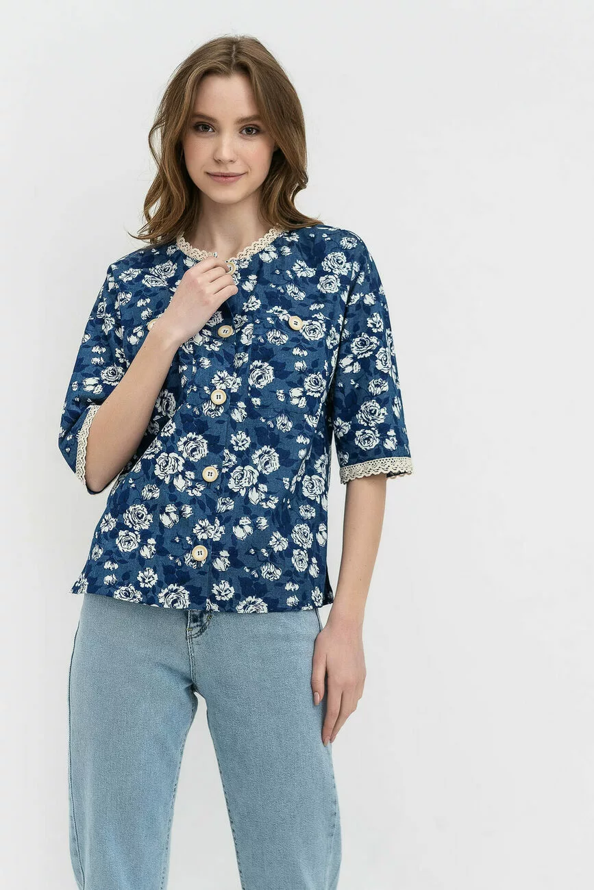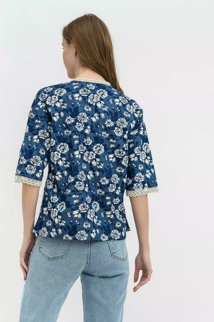 Вільний силует цієї жіночої блузи – це гарантія того, що вона гармонійно «сяде» абсолютно на будь-який тип фігури. Класичний крій зі спущеним плечем і круглою горловиною дозволить вам поєднувати цю модель жіночої блузи з будь-яким базовим низом: джинсами, бавовняними штанами або спідницею. Справжньою окрасою цього стильного жіночого одягу є розкльошені рукави довжиною ?. Як декор вибрано мереживо, яке органічно поєднується з рослинним принтом.