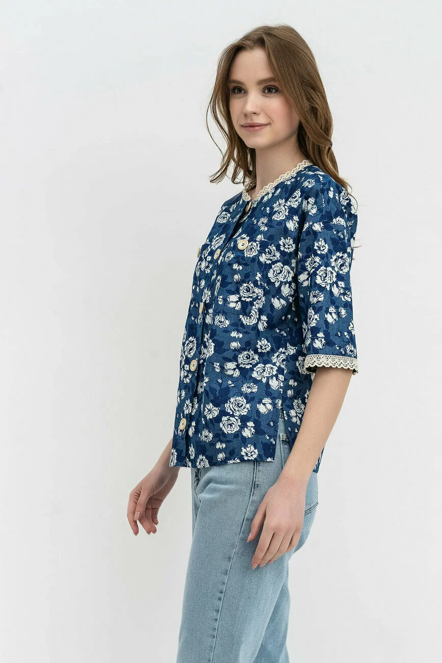 Вільний силует цієї жіночої блузи – це гарантія того, що вона гармонійно «сяде» абсолютно на будь-який тип фігури. Класичний крій зі спущеним плечем і круглою горловиною дозволить вам поєднувати цю модель жіночої блузи з будь-яким базовим низом: джинсами, бавовняними штанами або спідницею. Справжньою окрасою цього стильного жіночого одягу є розкльошені рукави довжиною ?. Як декор вибрано мереживо, яке органічно поєднується з рослинним принтом.