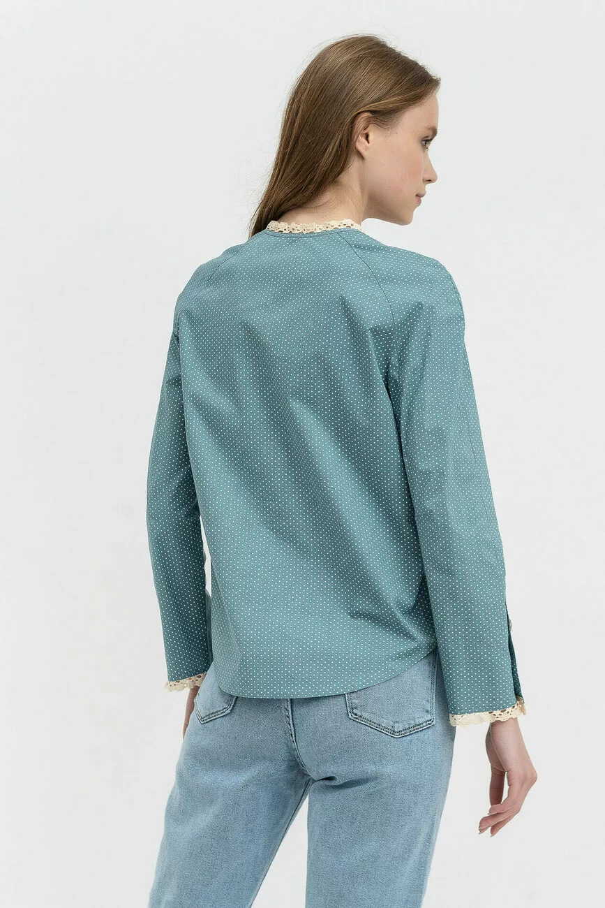 Родзинкою моделі є тонке мереживо, яким прикрашені комірець-стійка та низ рукавів. Попереду виріб застібається на ґудзики, низ – закруглений. Носити сорочку можна як зі штанами, так і з різними модними спідницями. Вона чудово підійде для роботи в офісі або ж для вечірніх прогулянок.