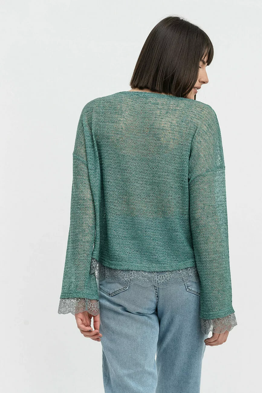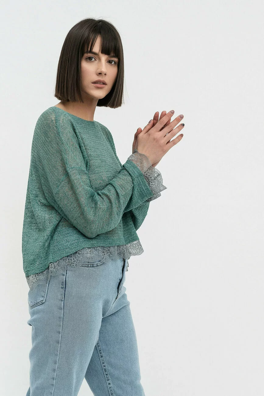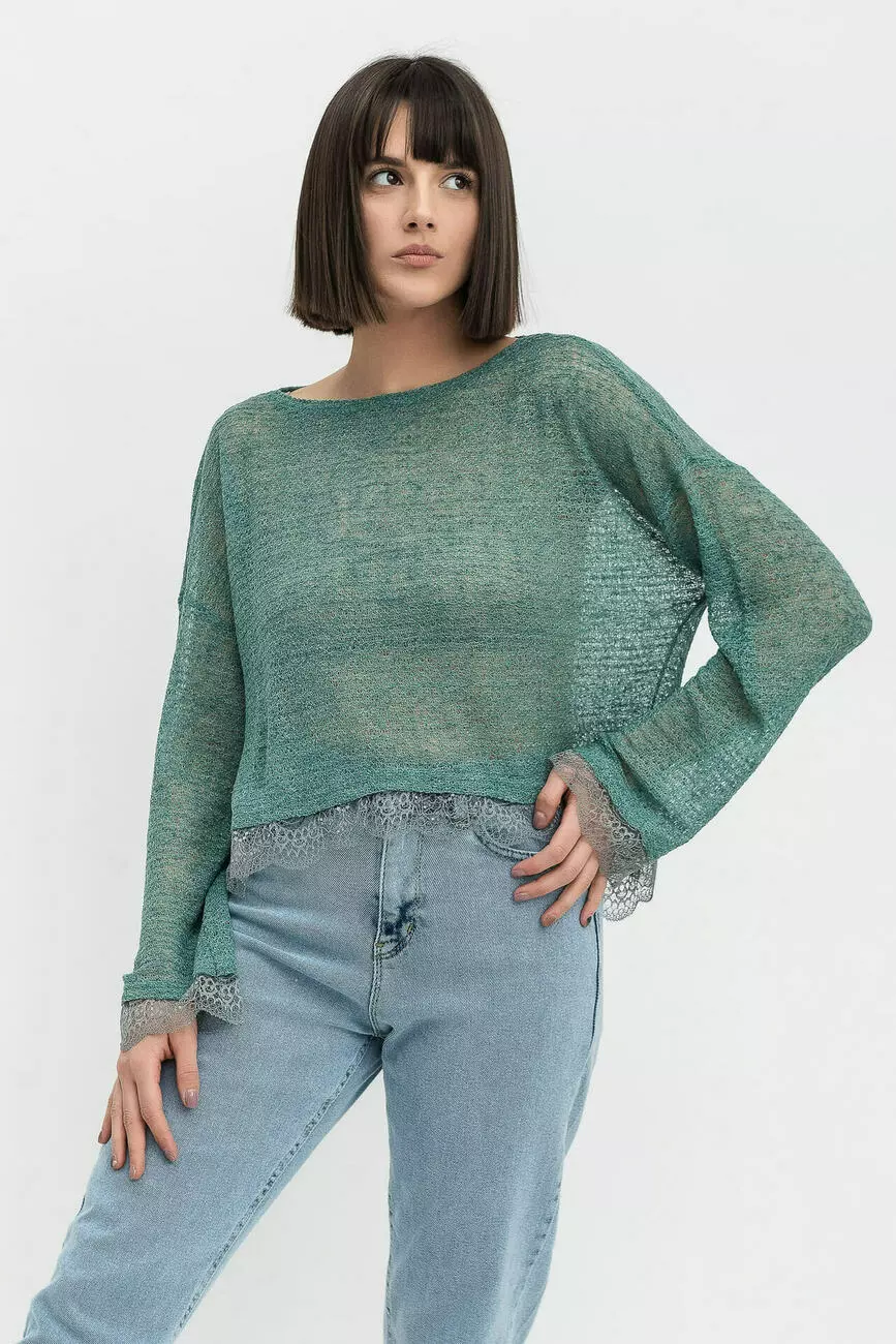 Масло трикотаж світлого зеленого тону з легкою домішкою сірого дуже незвично в своєму відтінку. Модель оверсайз/вільний силует є повною протилежністю одягу, який створений суто по фігурі. Сміливі мотиви з асиметрією передньої і задньої половинок ніби кидають виклик суспільству, звиклому до розміреності і порядку. Горловина-човник створює м'який контур ліній, спущене плече забезпечує більшую волю рухам, а розміщене по низу декор-мереживо нагадує про часи шляхетних лицарів і їх коханих.