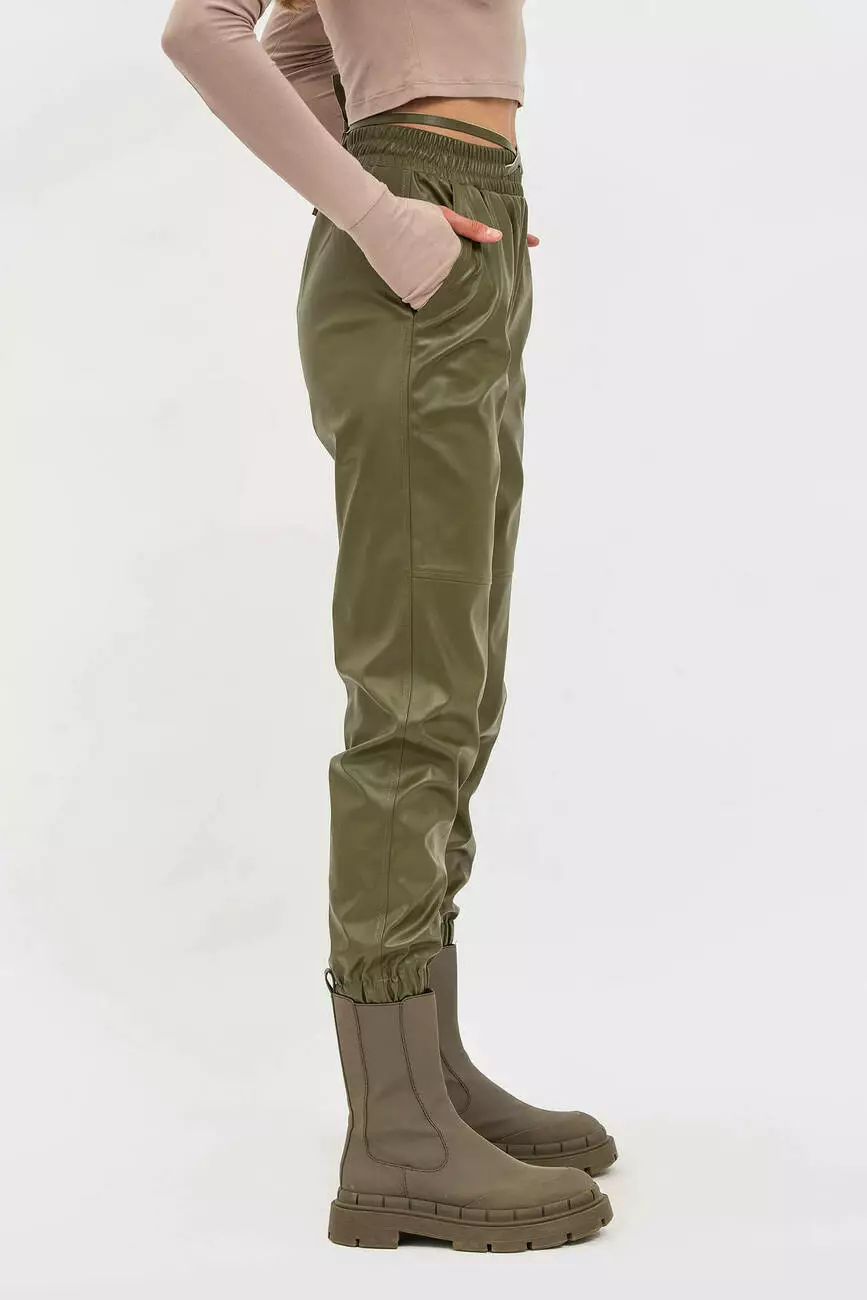 Джогери – найпопулярніші жіночі штани сезону 2021! Матеріал виробу – екошкіра стрейч кольору хакі. Комфортну посадку забезпечує широка резинка зі шнурком на талії, а також резинки внизу. Штани трохи вкорочені та завужені до низу. Поспішайте купити жіночі штани цієї моделі в нашому інтернет-магазині жіночого одягу!