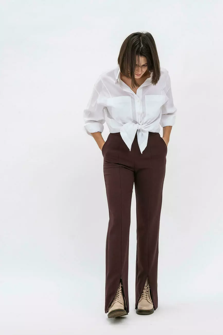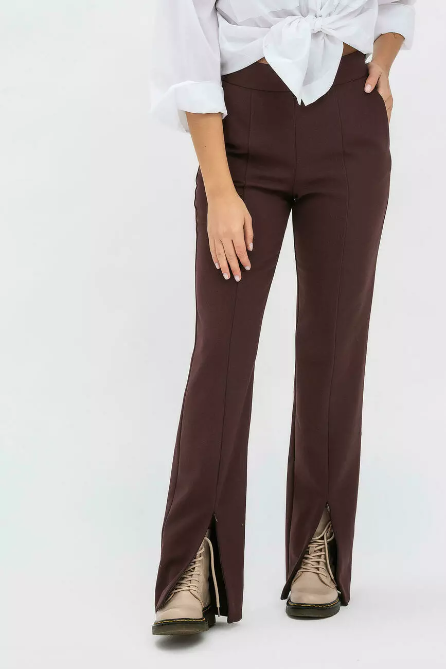 Жіночі стильні штани з розрізами попереду – хіт цього сезону! Тканина – костюмний креп коричневого кольору. Модель гарно сидить на фігурі, з акуратним вшивним поясом на талії. По боках є невеличкі кишені. Застібаються на блискавку. Модель ефектно виглядає як із взуттям на шпильці, так взуттям на низькому ходу. Поспішить купити жіночі штани на нашому сайті одягу!