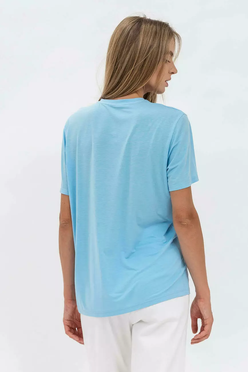 Це проста трикотажна футболка ніжного блакитного відтінку, і для неї у вашому гардеробі абсолютно точно знайдеться місце. З джинсами та кедами – на прогулянку, з легкими брюками та жакетом – для створення дрес-коду, а ще вона підійде для занять спортом або йогою – мультиуніверсальний формат без надмірностей. Модель можна доповнити будь-яким аксесуаром: базова жіноча футболка з круглою горловиною та широким коротким рукавом «прийме» будь-які декорації.