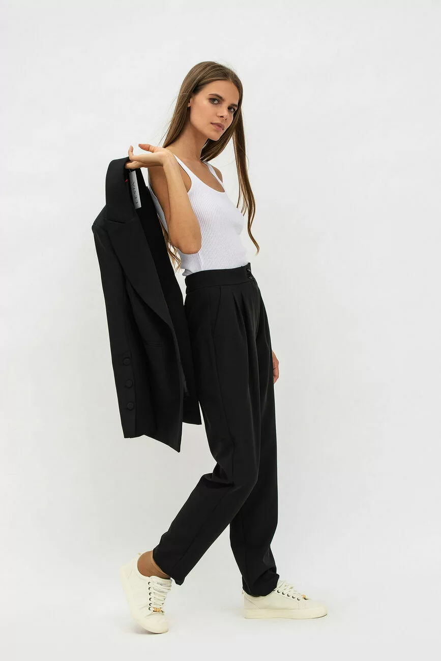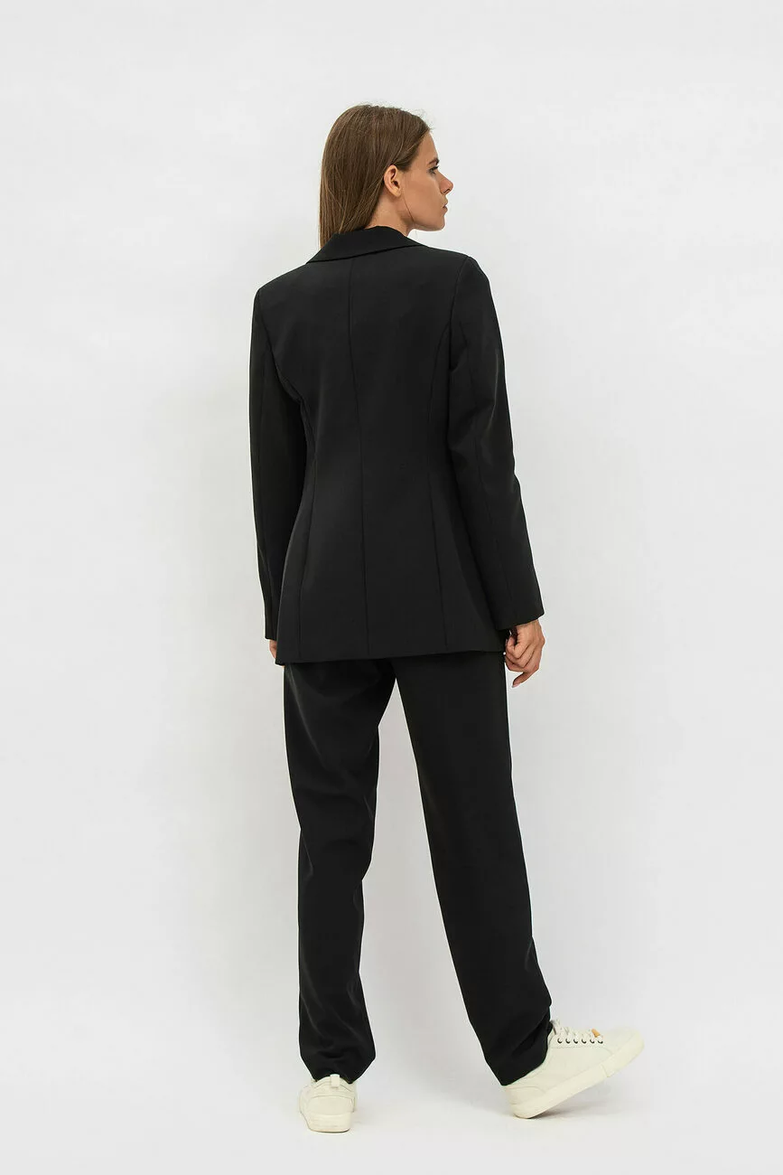 Від цієї моделі чорного жіночого костюма неможливо відвести погляд! Він допоможе вам створити свій ідеальний образ! Жіночий жакет приталеного крою доповнено відкладним коміром та лацканами. Рукав довгий, втаєний. Стильні штани прямого крою, вільні, а по боках є кишені для більшої зручності. Будьте елегантні, жіночні та досконалі у стильних жіночих костюмах від нашого бренду!