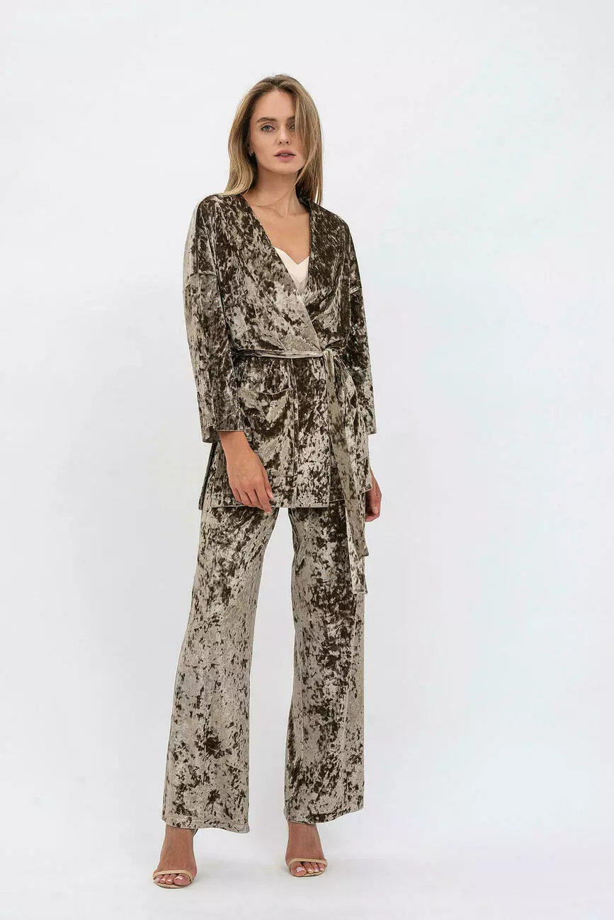 Бельевой стиль в праздничной интерпретации – уже в интернет-магазине женской одежды! Это – модный костюм для женщин, в котором в тандеме сразу несколько преимуществ: стиль, комфорт и wow-эффект. Однотонный велюр роскошно смотрится именно в такой архитектуре: удлиненном кардигане на запах и прямых длинных брюках на резинке. Скованности – нет, стильной женской одежде – да!