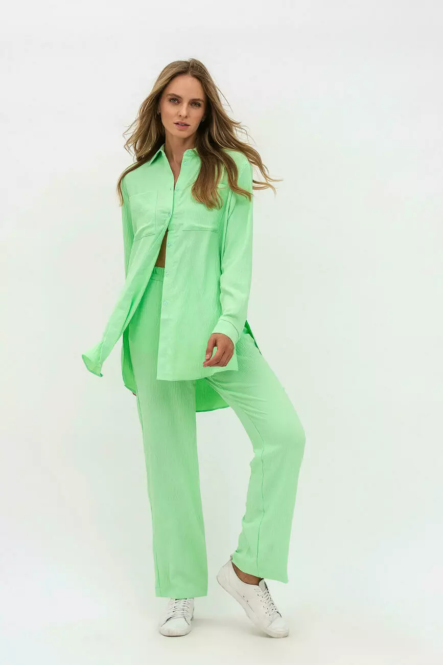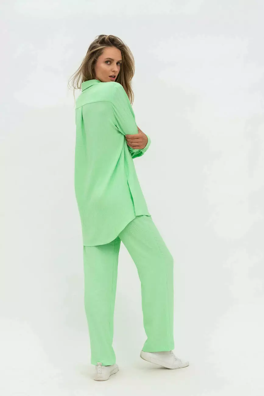 немного приспущенную линию плеч. Рукава длинные, с манжетами. Застегивается блуза на пуговицы, расположенные на центральной планке. Брюки фиксируются на талии с помощью широкой резинки. Это универсальная модель на каждый день или на событие.Не отказывайте себе в красоте, Вам точно понравится)