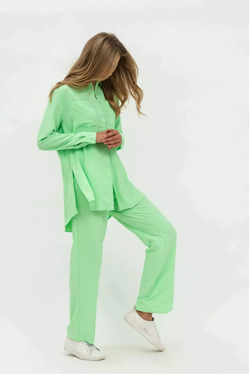 немного приспущенную линию плеч. Рукава длинные, с манжетами. Застегивается блуза на пуговицы, расположенные на центральной планке. Брюки фиксируются на талии с помощью широкой резинки. Это универсальная модель на каждый день или на событие.Не отказывайте себе в красоте, Вам точно понравится)