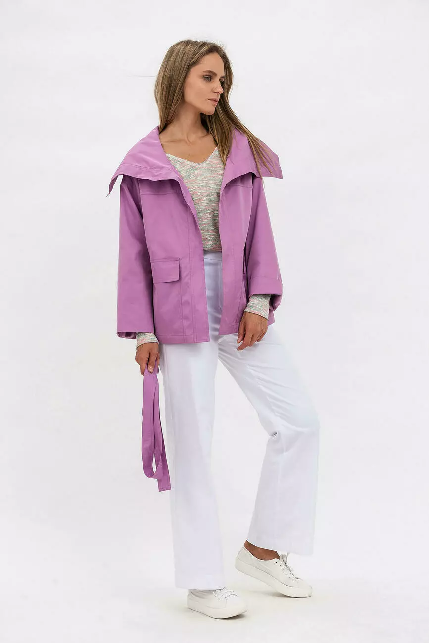 Елегантна подовжена жіноча куртка з плащової тканини прямого силуету під пояс - той самий мастхев, без якого складно сформувати весняний образ. Ніжний бузковий відтінок в моноформаті гармонійно виглядає в цьому оригінальному крої. Двобортна, ця стильна жіноча куртка доповнена трендовим коміром Апаш, широкими рукавами з манжетою на хлястику. Глибокі кишені сховані у бічних швах. Зручна довжина до середини стегна дозволить поєднувати цю куртку для жінок з сукнею, брюками та спідницею.
