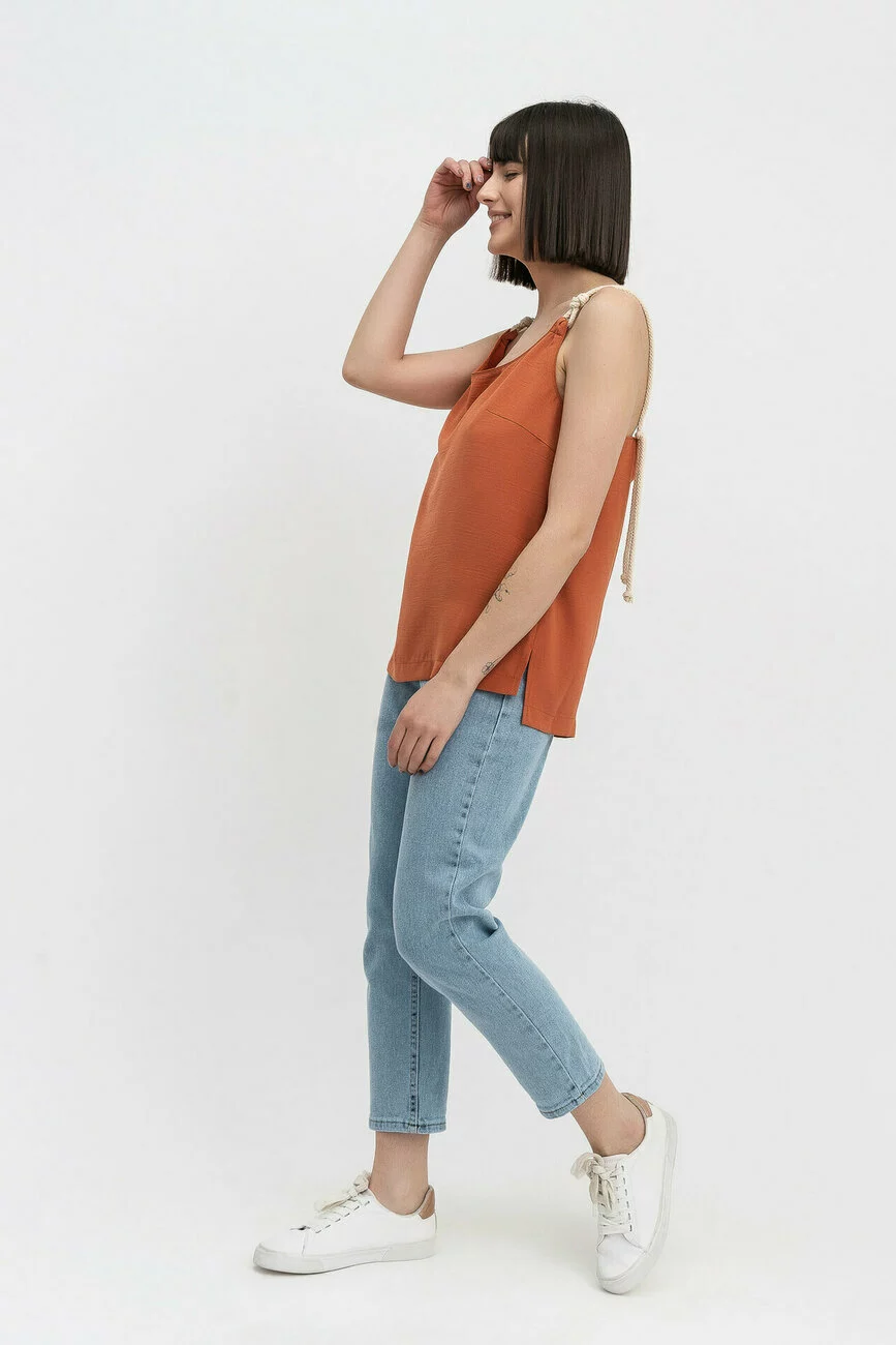 Легка блуза з «дихаючого» матеріалу. Гайд-лайном тут став шнурок, кінці якого звисають на спину, а сам він виконує роль бретелей. Дамам дуже подобається штапель. М'який, екологічний, не змінює кольору під сонцем. Майка вільного силуету так і запрошує одягтися в літню обновку! Білі бретелі регулюються: шнурівка виглядає трохи зухвало і нагадує мініатюрні морські канати, просолені водами океана. В якості аксесуару чудово підійде сумочка-менадьер на довгій ручці, яка підкреслить фривольність образу. А якщо додати круглі окуляри-тішейди, то крапелька ретро буде дуже доречною. Блуза вільного силуету чудово гармонює з широкою прінтована спідницею (під колір верху), кюлотами.