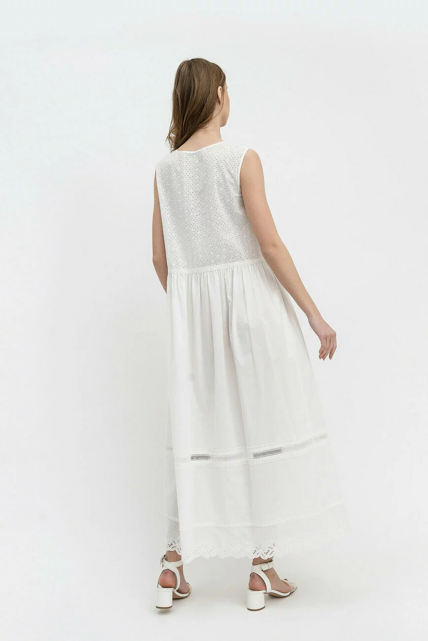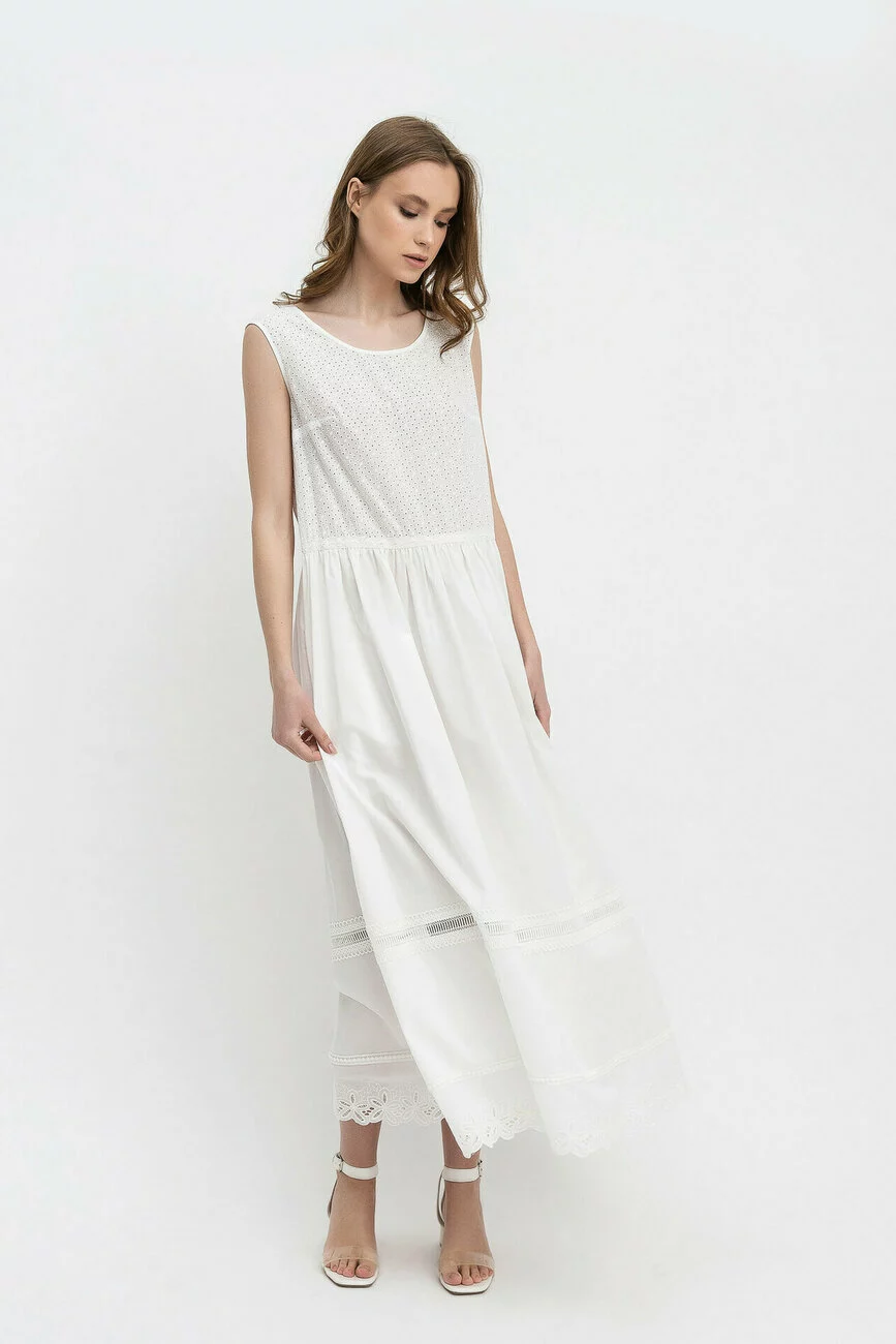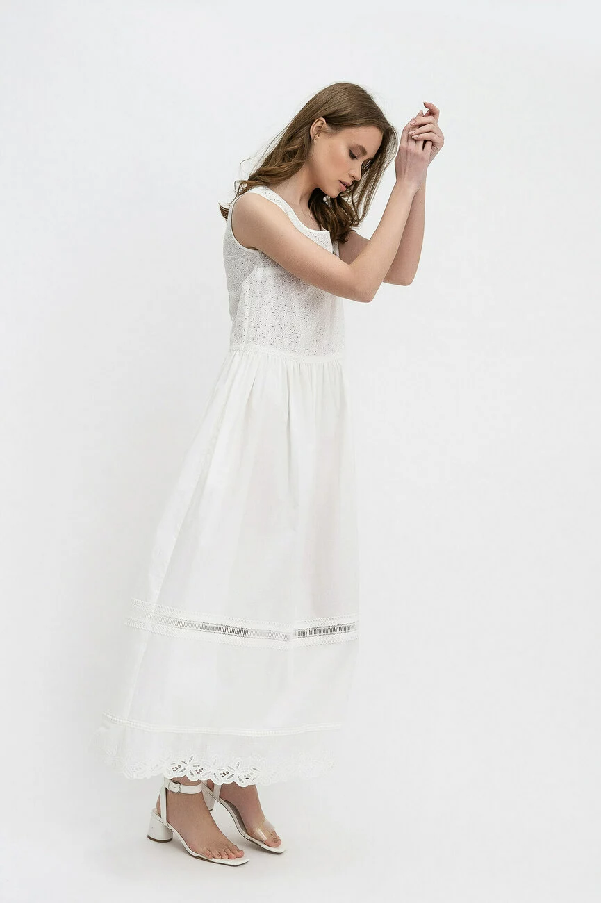 Модель має вільний фасон, глибокий круглий виріз горловини та спідницю зі зборками. Прикрашає виріб вставка із мережева на спідниці. Цей жіночий сарафан можна носити як на роботу, якщо не має суворого дрес-коду, так і на прогулянки з дітьми або з друзями. Купити жіночі сарафани в Україні ви можете через інтернет-магазин LESIA.