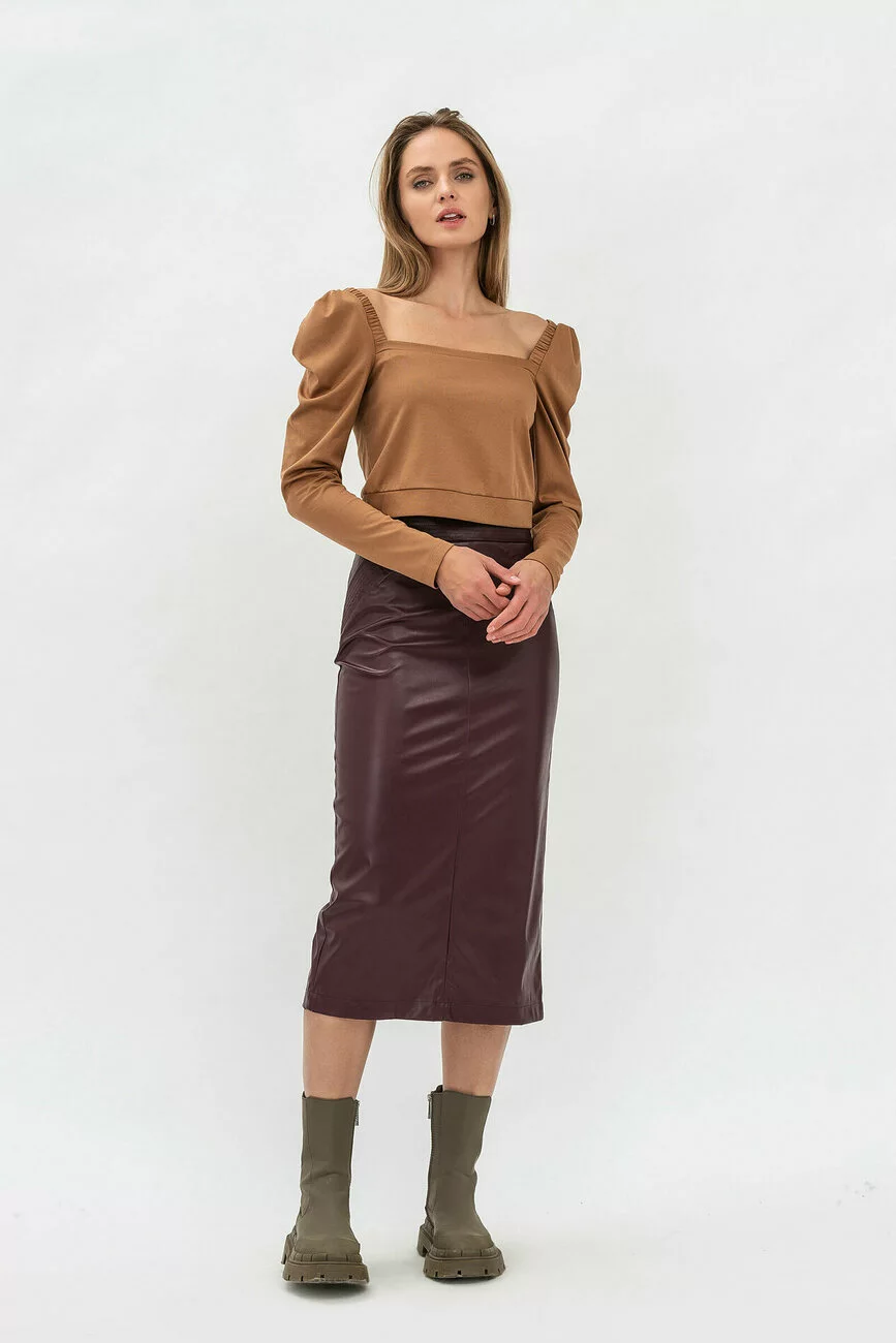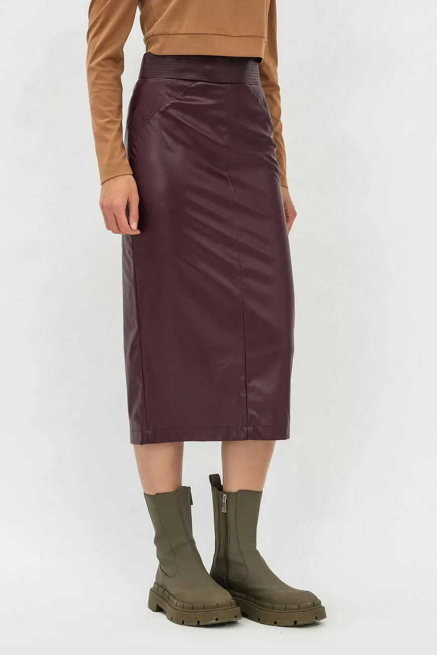 Ефектна спідниця, яка заслуговує на сотні компліментів! Модель вигідно підкреслює фігуру своєї хазяйки та притягує погляди оточуючих людей. Тканина – екошкіра стрейч. Силует звужений, довжина – міді. Пояс на талії вшивний. На пілці є центральний шов та оздоблювальна деталь з відстрочкою. Позаду по спинці – центральний шов та шліца. Застібається спідниця на приховану блискавку. Захоплюйте своїми образами у модних спідницях від нашого бренду!