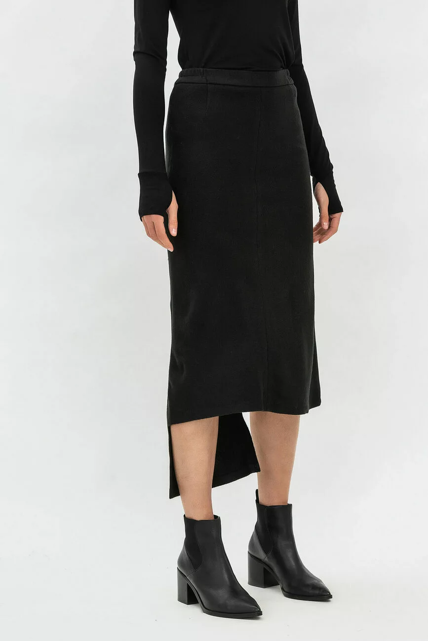 Небанальні речі з родзинкою – ось, що диктує мода в цьому році! Трикотажна модна спідниця міді з асиметричним низом стане оригінальною моделлю у вашому гардеробі! Силует виробу прямий, вигідно виглядає на панянках з будь-яким типом фігури. Цікаве дизайнерське рішення спідниці не лише приваблює увагу, але й чудово комбінується з різними жіночими блузками та взуттям.