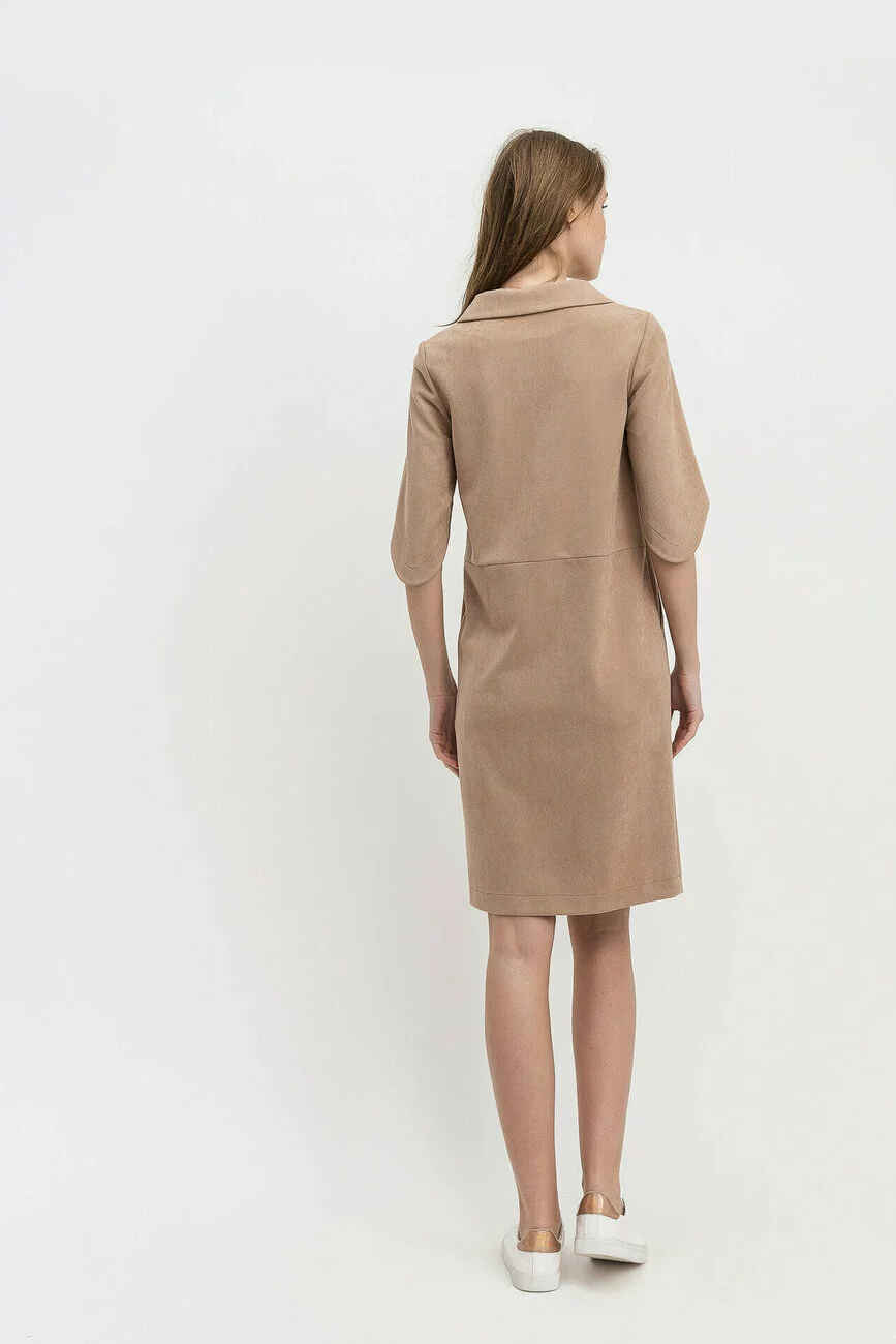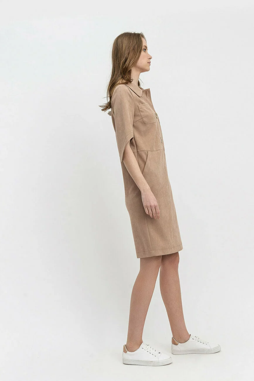 Одяг в бежевого-пудрових відтінках завжди актуальний, бо здатен підкреслити ніжний рум'янець, доглянуту шкіру і сяйво молодості. Модель «футляр» має вшивні рукава 3/4, які по низу ззаду довше, ніж спереду. У виробі зроблений надріз нижче талії. Комір відкладений, без стійки, зовнішні кишені імітують сорочковий стиль. Великі гудзики підібрані в тон сукні. При виготовленні продукції використана тканина трикотаж, довжина міді. Такий одяг добре комбінується з туфлями-човниками, а комір можна доповнити шийною хусткою з брошкою.