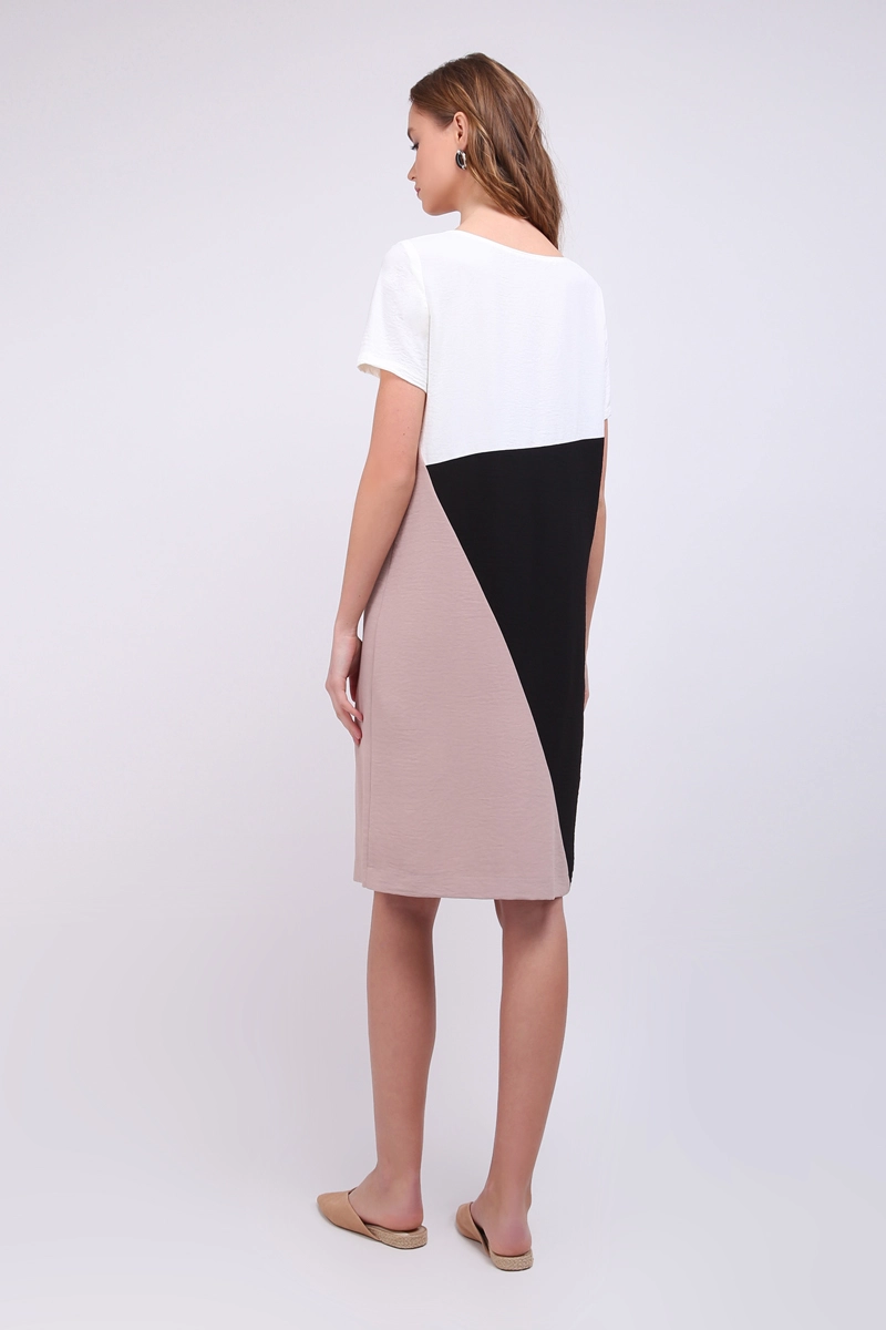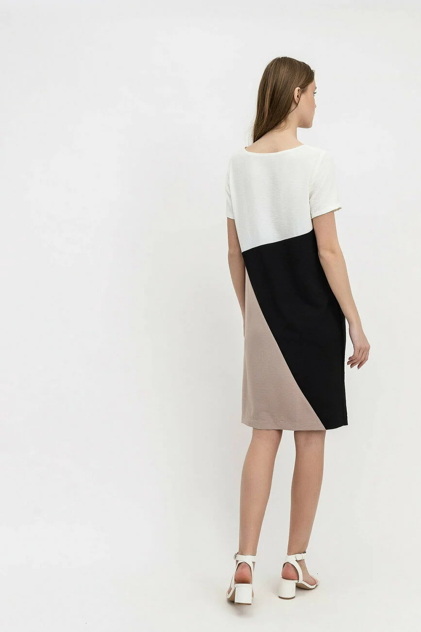 Переваги, які дає своїй власниці плаття-футляр – це можливість продемонструвати основні особливості жіночої фігури, акуратно заховавши наявні недоліки. А якщо їх немає, то це – вдвічі приємніше! Результатом стане підтягнутість фігури, для якої не обов'язково регулярно відвідувати тренажерний зал. Кругла горловина добре підходить для дамської шийки. Сукня з лініями рельєфу з трьох кольорів виглядає вельми оригінально в дизайнерському виконанні. Використана тканина – шифон щільний, жатка «Мадагаскар».