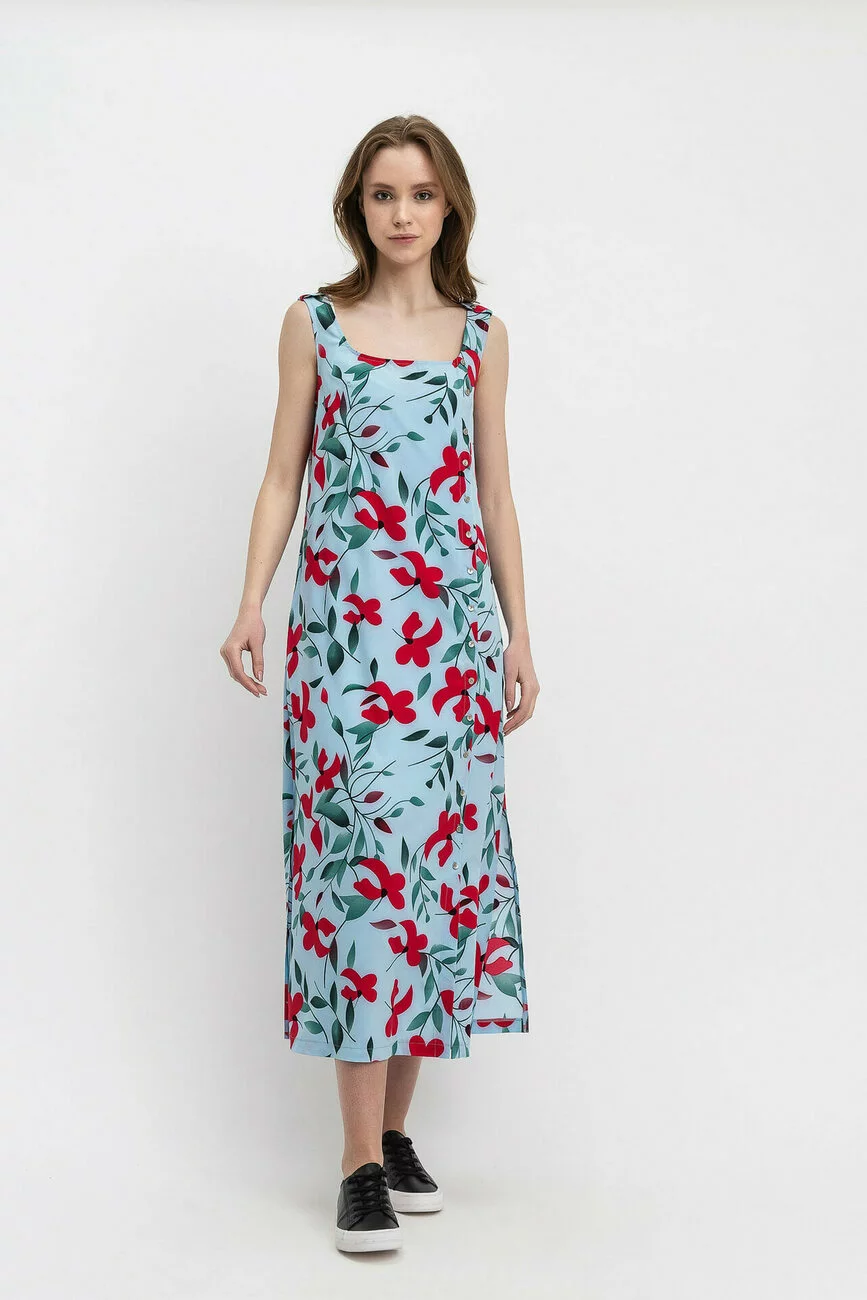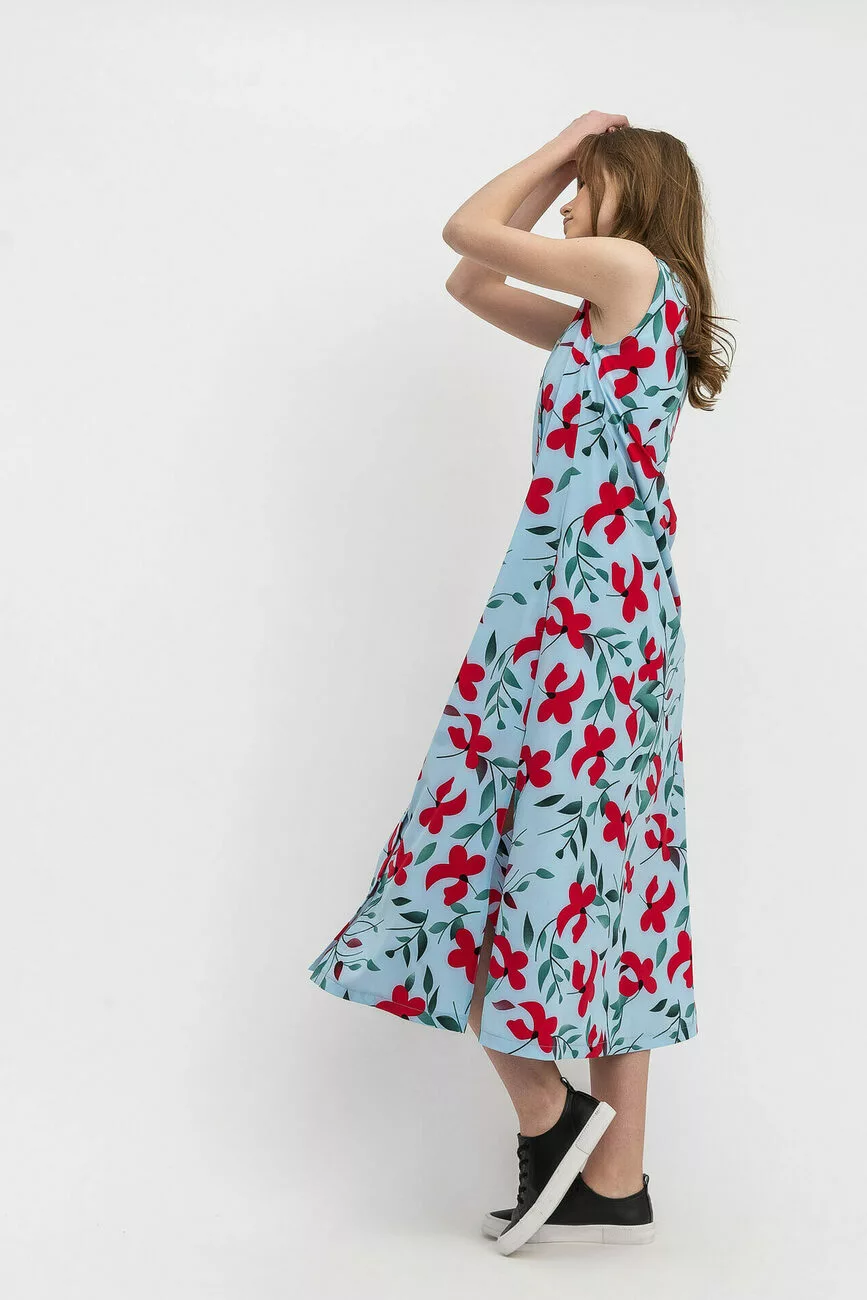 Чудесное красивое платье на бретелях длины миди подчеркнет красивую фигуру. В нем вы комфортно будете чувствовать себя на любом мероприятии. Нежно голубой фон и красные цветы на ткани наполняют энергией и дарят хорошее настроение на весь день.
