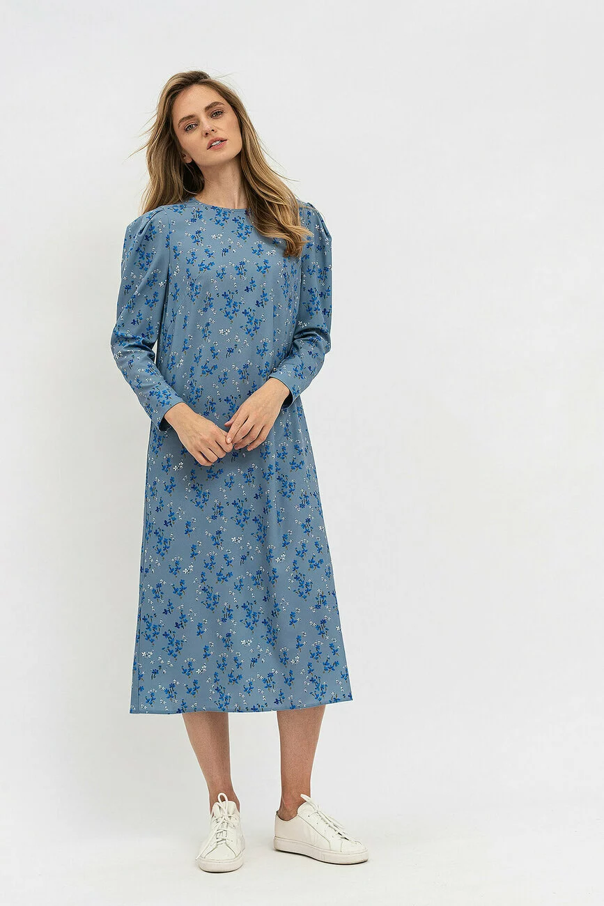 Модель зшита з крепу має квітковий принт. Сукня має круглий виріз горловини, довгі рукави та довжину міді.