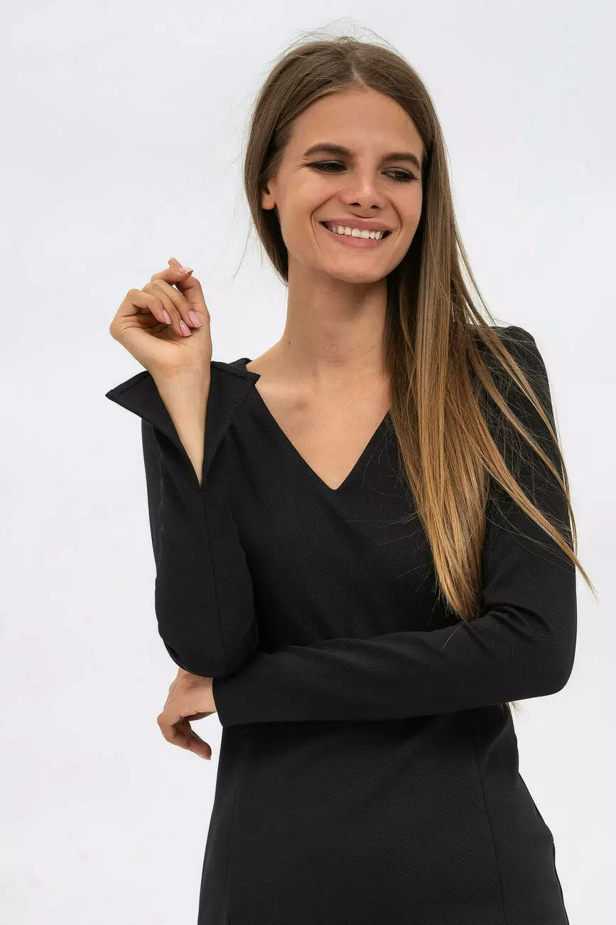 Та сама маленька чорна сукня, тільки в інтерпретації трендів 2022. Модель стильної жіночої сукні миди-длины Амата - зразок того, наскільки гармонійним може бути чорний без зайвих акцентів. Приталений силует, V- образна горловина, втачной вузький рукав з кокетливим манжетом з розрізом. Довжина нижче коліна компенсується грайливим вирізом збоку. Розкішний варіант як в соло, так і в дуеті з жакетом або кардіганом.