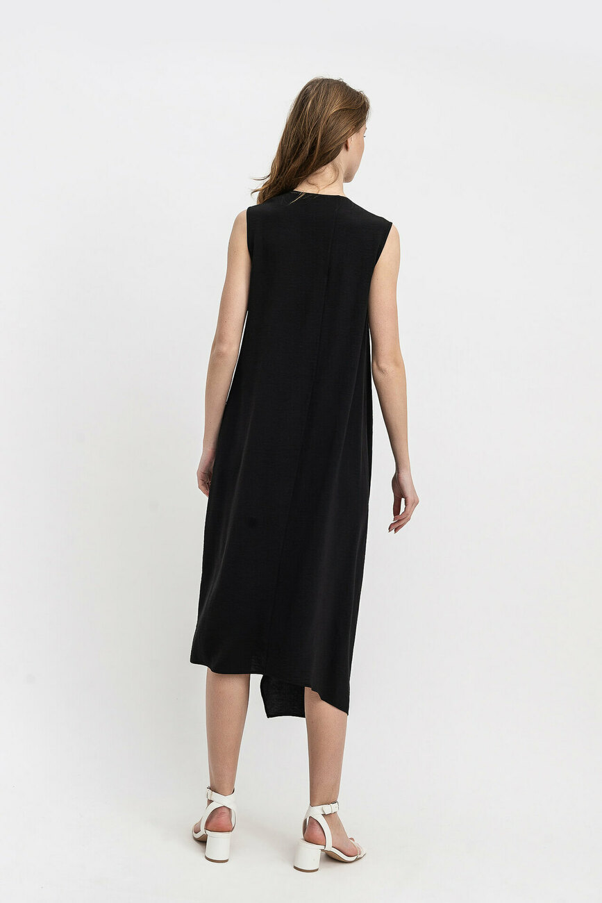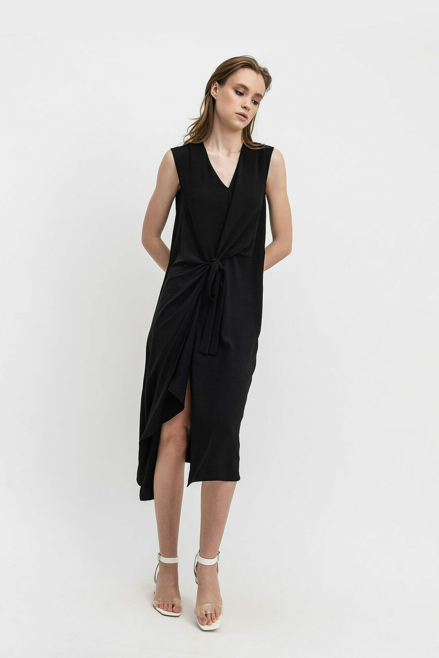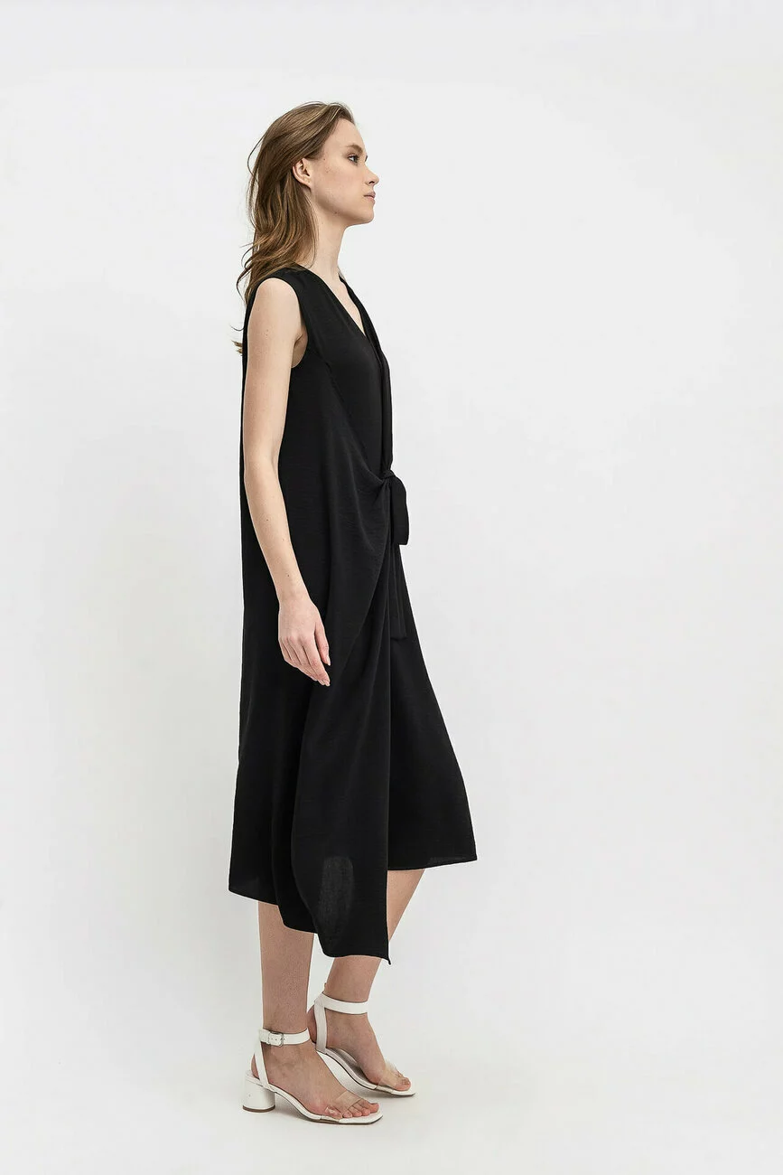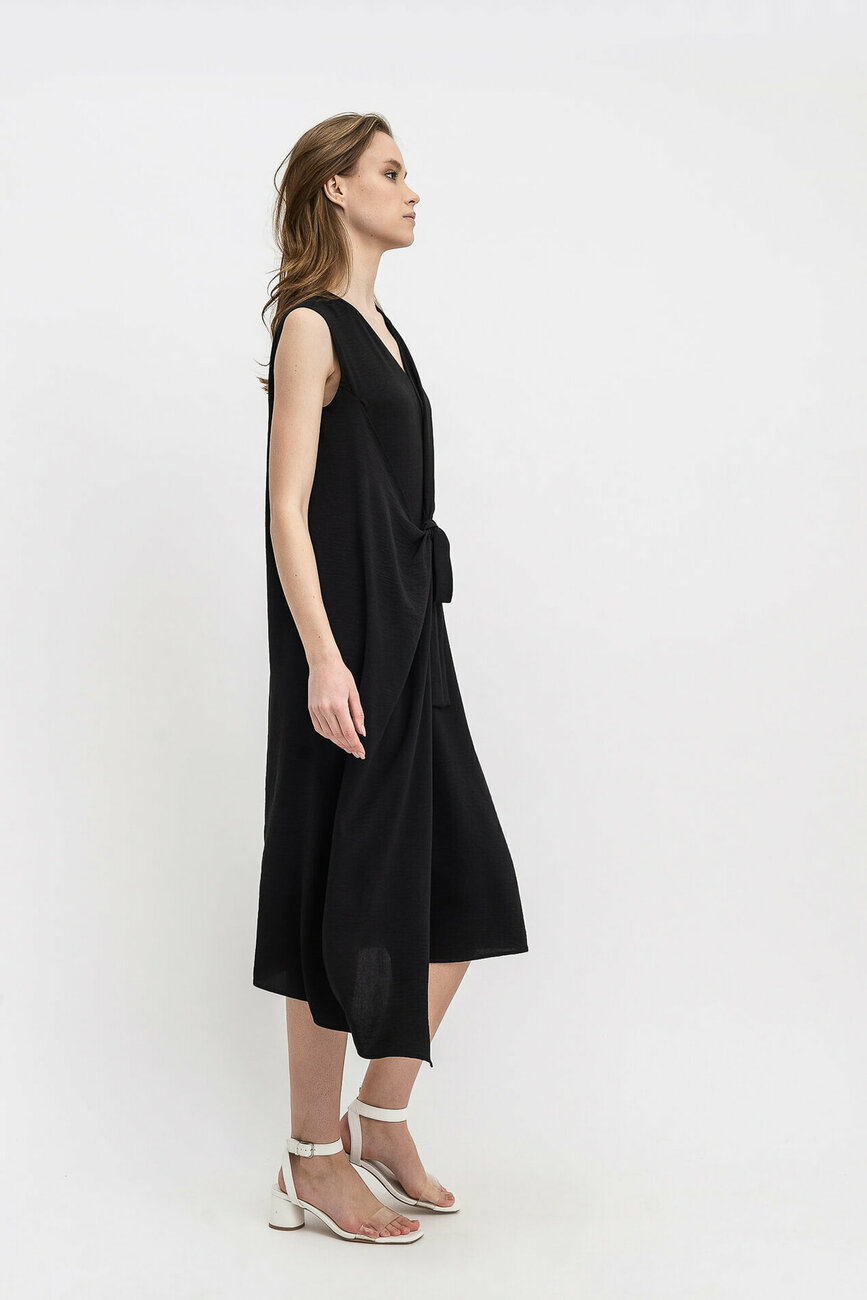 Стиль «кежуал» досить привабливий для молоді. Він зручний в носінні і висловлює незгоду із загальноприйнятими нормами, відрізняючись зухвалістю сприйняття. Для чорної сукні був обраний шифон – саме цей матеріал забезпечує достатній повітрообмін для тіла, незалежно від обраного кольору. Незвичайність крою виражена в однобічній виточці в області талії та асиметричних половинках сукні, при яких права сторона зроблена довшою. Пояс зав'язується попереду і утворює збірки, що м'яко розподіляються вгору і вниз. З лівого боку зроблена врізна кишеня.