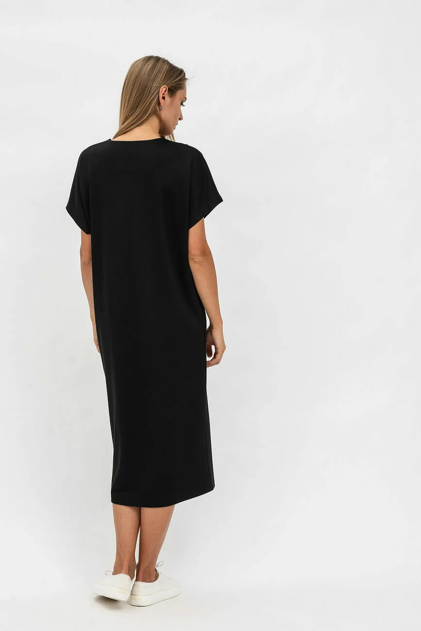 Колман – це зручна літня жіноча сукня, в якій слово «комфорт» стане синонімом вашого образу. Пошитий з тонкого трикотажу в прямому силуеті і з коротким рукавом, він органічно впишеться і в дрес-код, і в прогулянковий формат. У-подібна горловина акцентує увагу на шиї, з одного боку полички є кишеня. Дизайнери задумали цю гарну сукню для жінок універсальною, тому у нього міді-довжина та спущена лінія плеча.