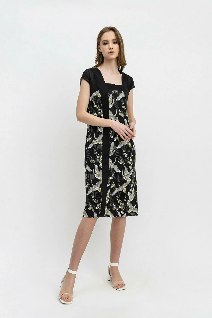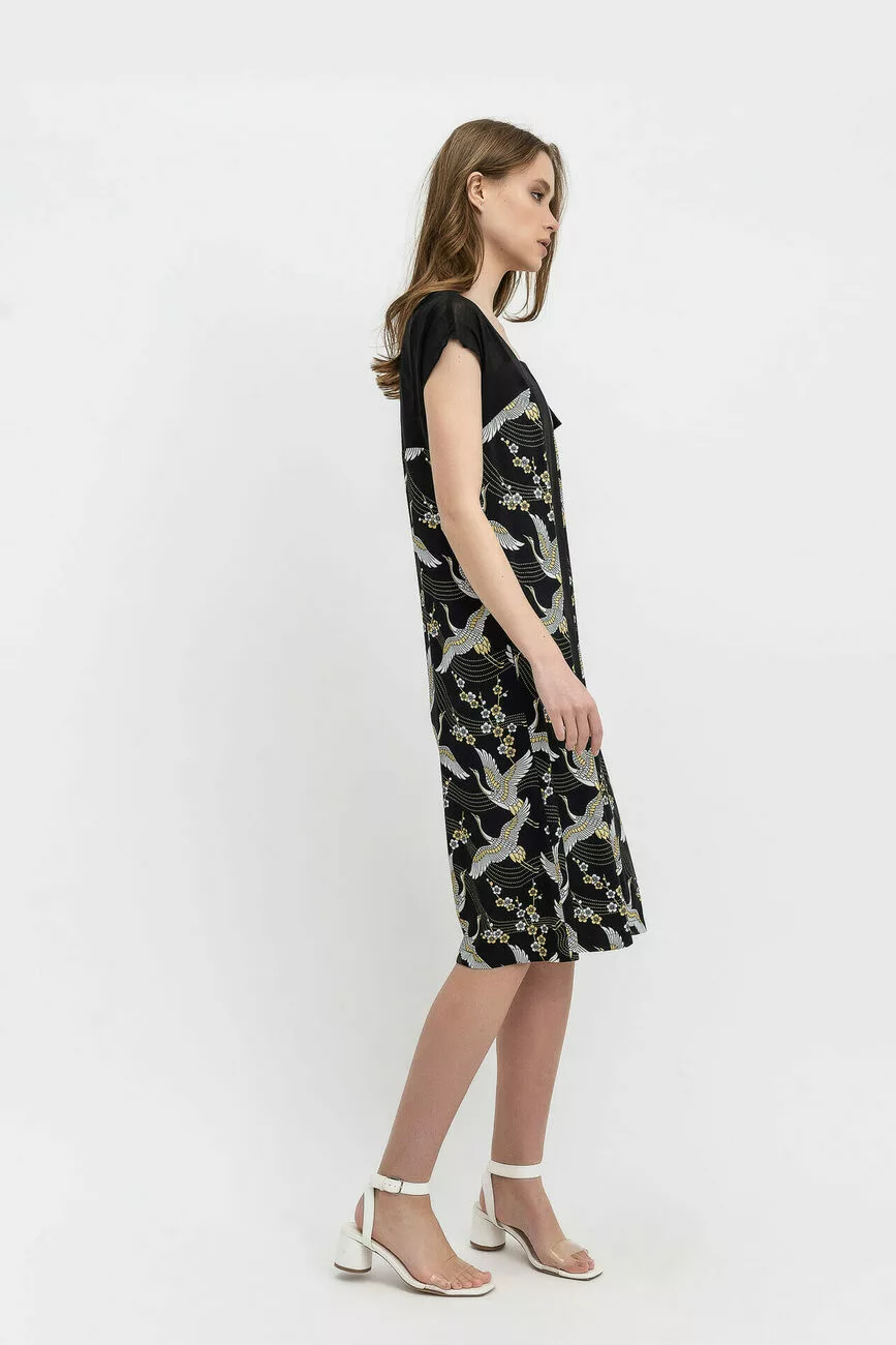 В этом платье главной изюминкой является принтованная ткань. На черном фоне летящие журавли смотрятся очень эффектно! От модели веет японскими мотивами, именно поэтому и дизайн изделия достаточно лаконичный. В этом стильном платье вы всегда будете обращать на себя внимание!