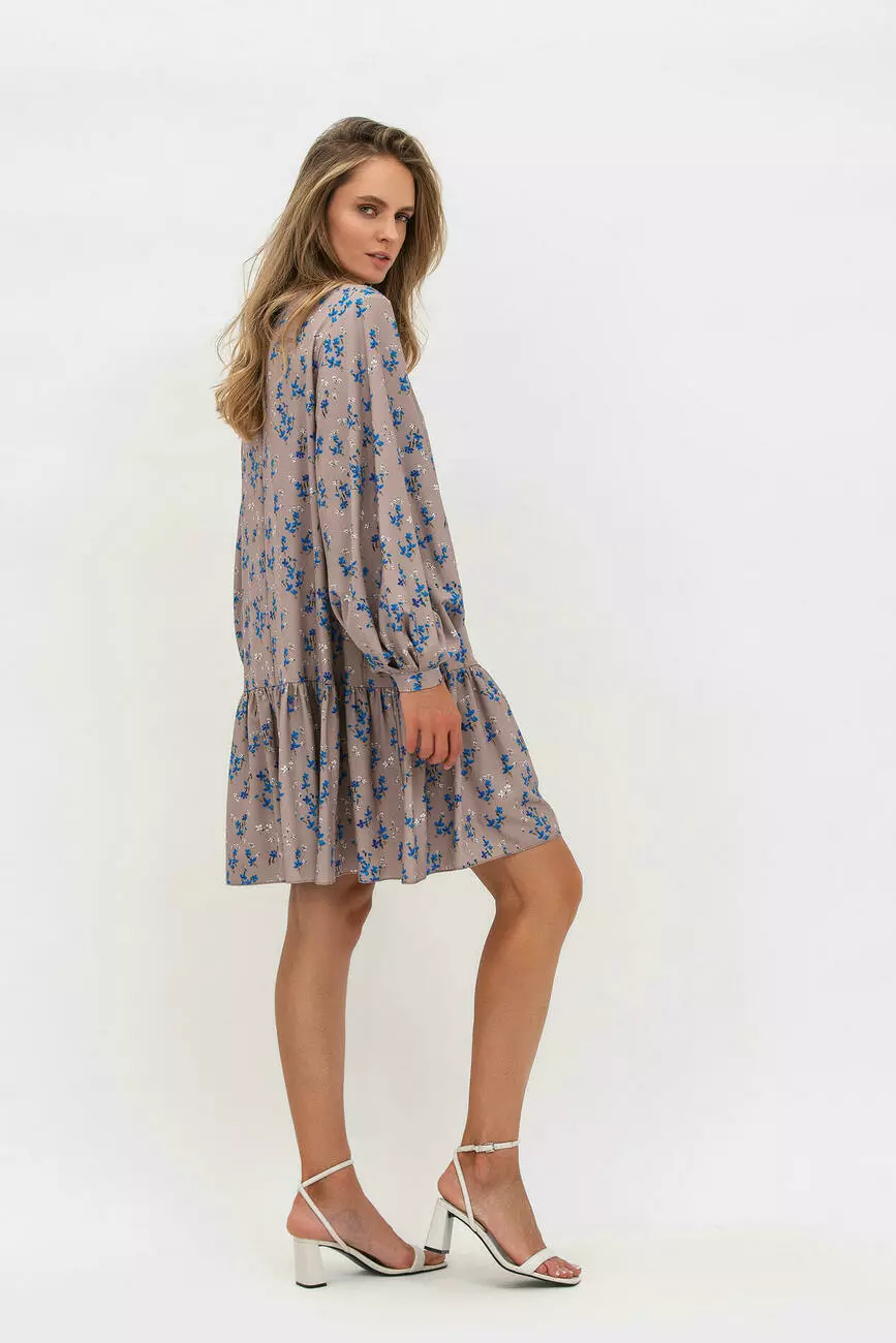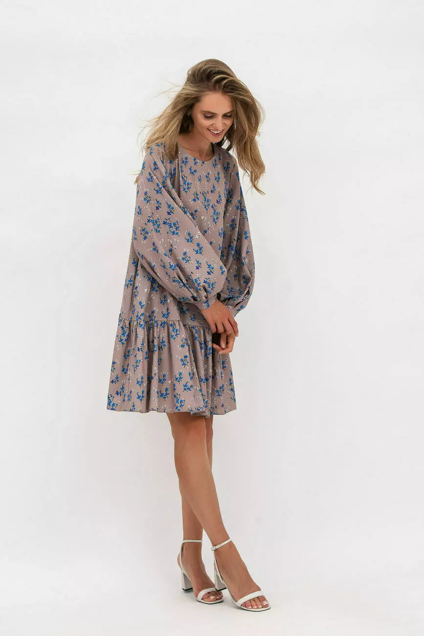 Вільна модель у вигляді трапеції стилізована гарним воланом знизу та пишними рукавами. Тканина сатин комфортно відчувається на тілі, дозволяючи шкірі дихати. Довжина виробу – вище колін, а зробити образ більш кокетливим допоможе знімний бант.
