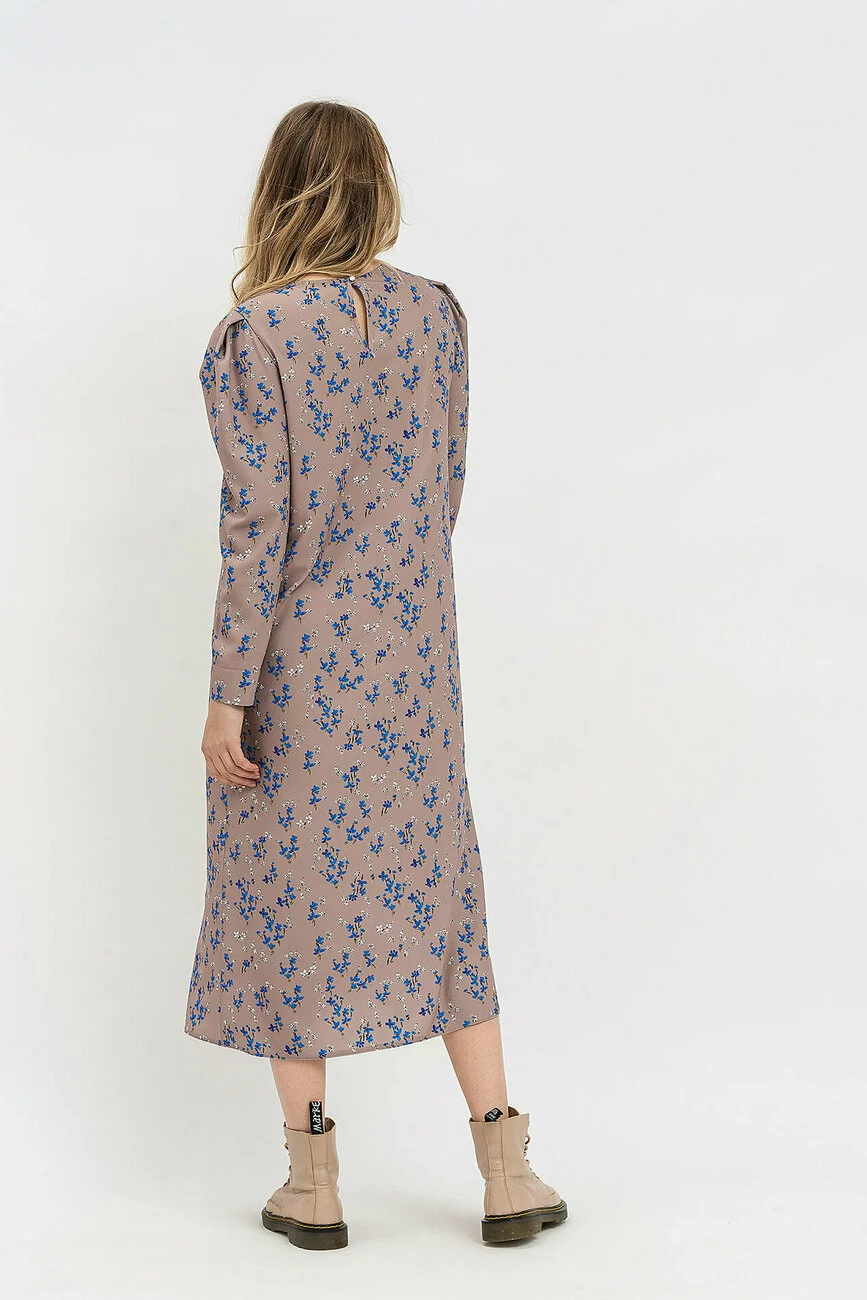 Модель зшита з крепу має квітковий принт. Сукня має круглий виріз горловини, довгі рукави та довжину міді.
