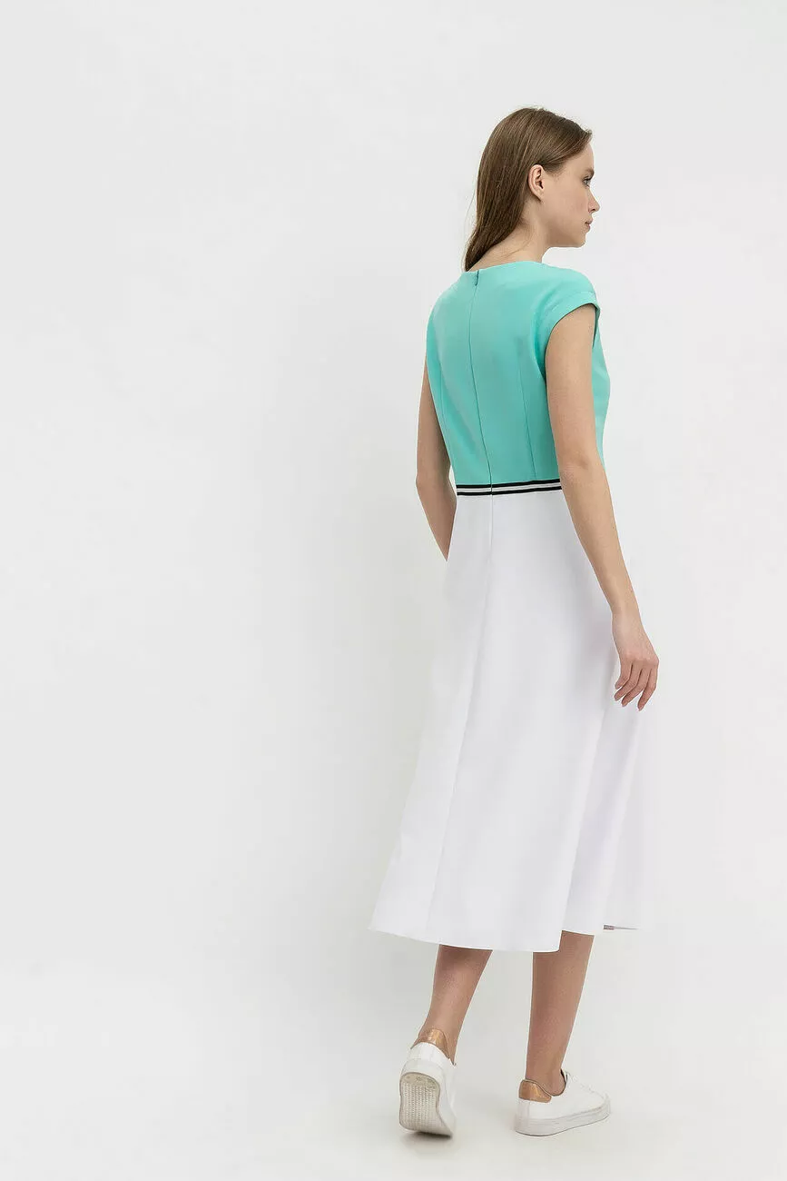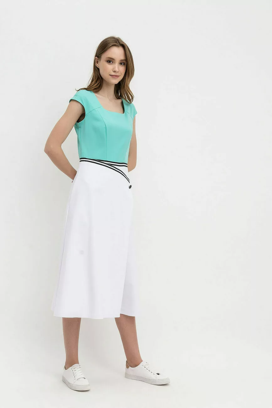 Тканина костюмка, приталений силует. Верх з глибокою круглою горловиною переходить в більш широкий низ «з запахом» - так виглядає Спідниця-трапеція Аля-кльош з розрізом. У відрізнній по талії сукні по шву нашита декор-стрічка, прикрашена пікантним гудзичком. Довжина міді дуже зручна, бо не обмежує хід. Спущене плече в виробі прикриває шкіру від надлишку сонця. Практичності додають неглибокі кишені в бічних швах. Сукня відмінно підходить для романтичних зустрічей і відпускного періоду.