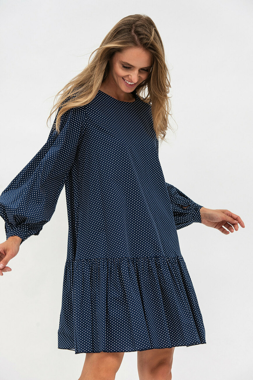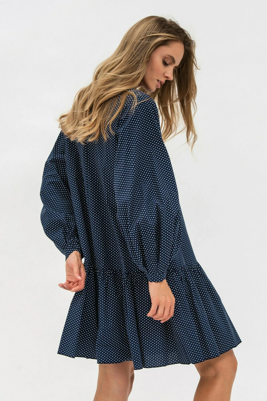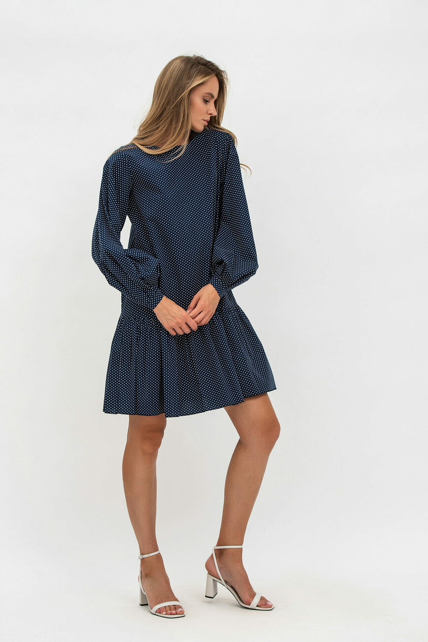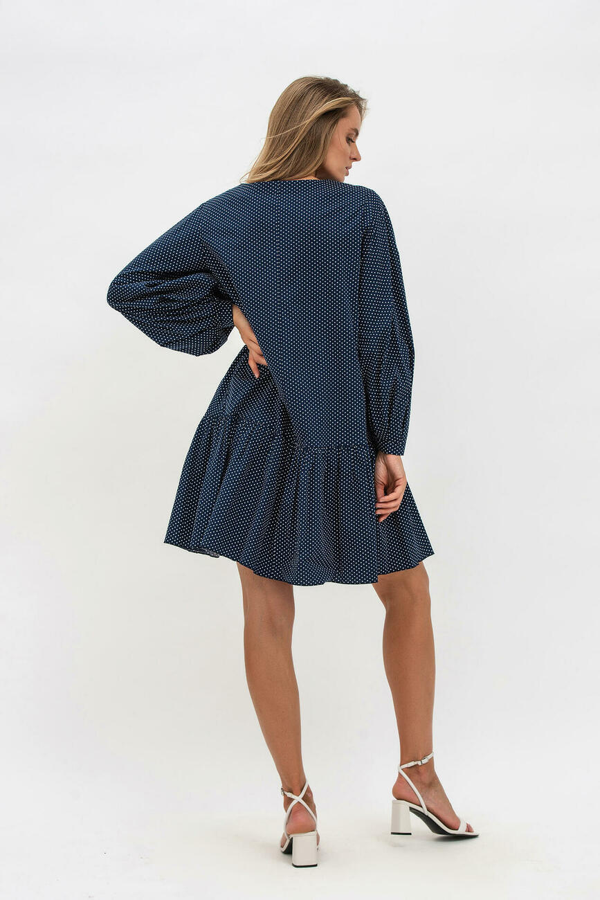 Вільна модель у вигляді трапеції стилізована гарним воланом знизу та пишними рукавами. Тканина сатин комфортно відчувається на тілі, дозволяючи шкірі дихати. Довжина виробу – вище колін, а зробити образ більш кокетливим допоможе знімний бант.