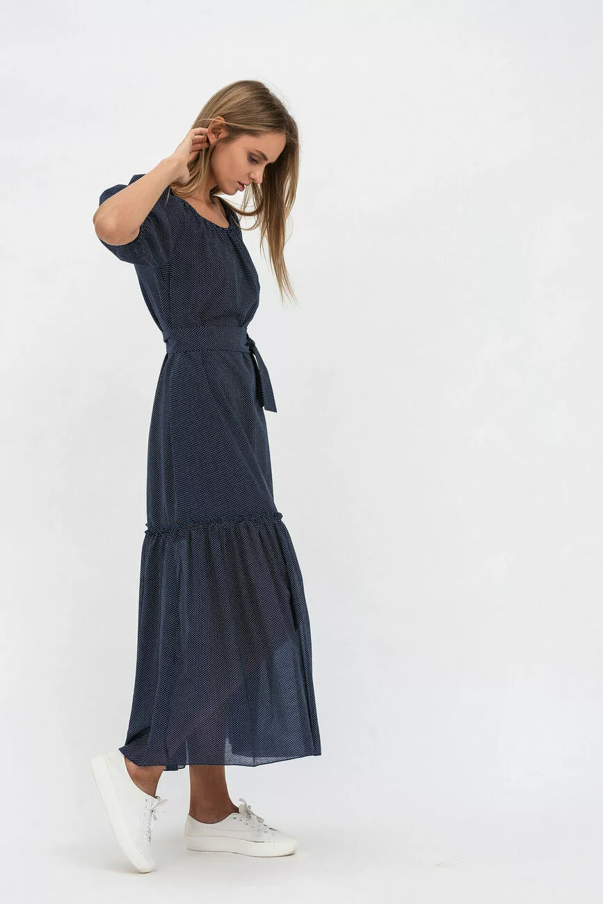 Довга жіноча сукня в цьому форматі – це дизайнерська інтерпретація добре відомої моделі «селянка», але в більш елегантному та жіночному її вигляді. Багатоярусна архітектура створена з шифону красивого синього кольору: вільний силует з горловиною на гумці, за допомогою якої можна відкрити плечі, широким рукавом, також зібраним на резинці, і високою оборкою по подолу. У комплекті є пояс, з яким лінія талії стає красиво підкресленою. Максі-довжина сукні для жінок акцентує увагу на красі матеріалу.