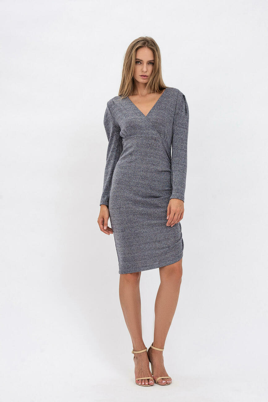 Роскошь 80-х в новом прочтении! Трикотажное женское платье с люрексом – приталенное, романтичное и невероятно подходящее для новогоднего настроения. Ничего лишнего: теплый серый оттенок платья, оптимальная длина до колена, объемный рукав по плечу и V-образная полочка на запах с красивой линией декольте. Это – та самая модная женская одежда, в которой вы будете чувствовать себя по-королевски!