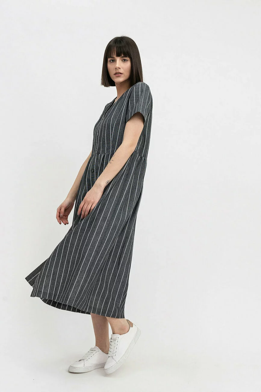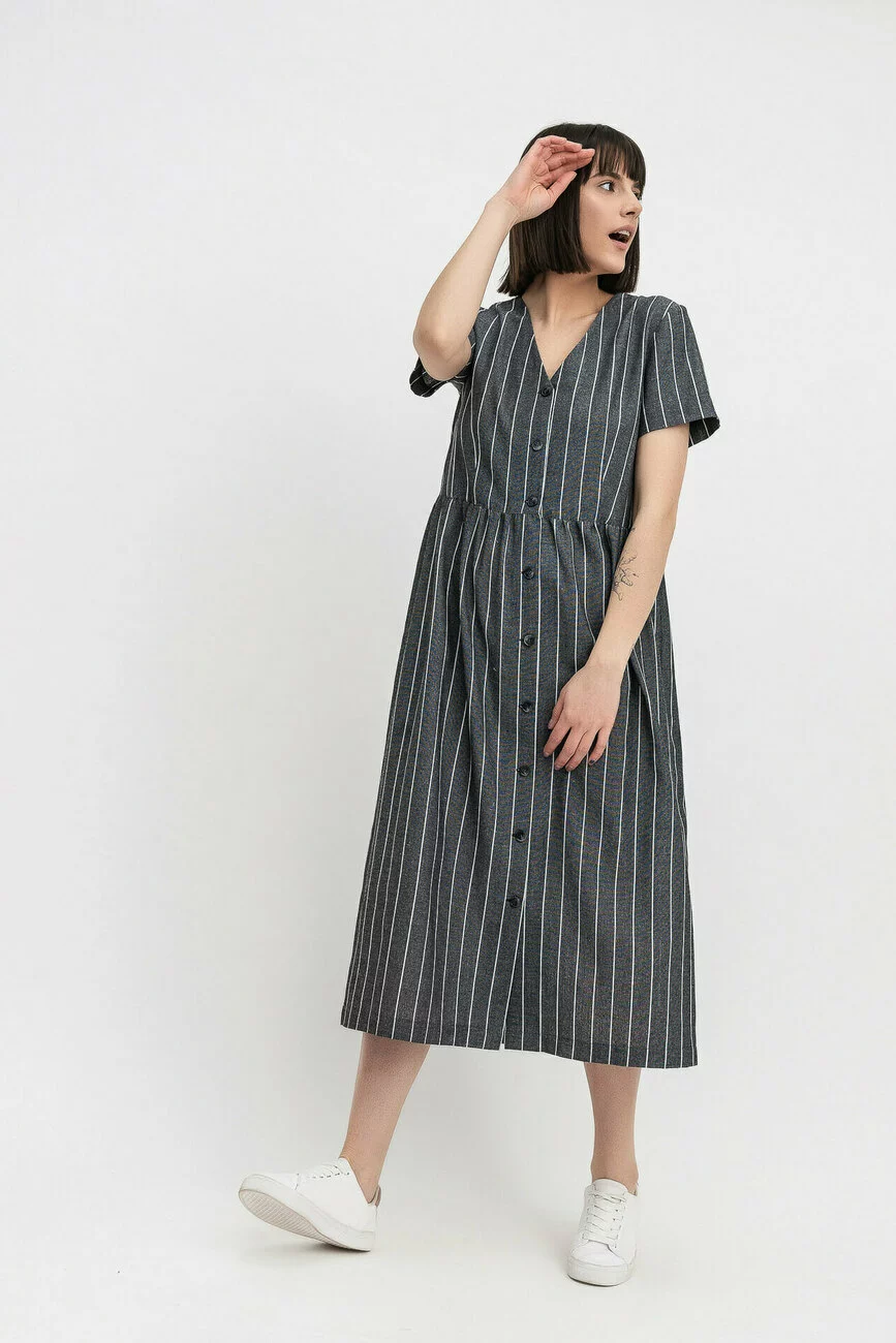 Виріб зшито з лляної тканини, яка вважається найкращим матеріалом для спекотних днів. Вертикальні смужки на тканині зорово витягують фігуру, роблять її стрункішою. Сукня має V-образний виріз горловини, короткі рукави та застібку попереду на ґудзиках. Ця стильна сукня стане незамінною у літньому гардеробі жінки!