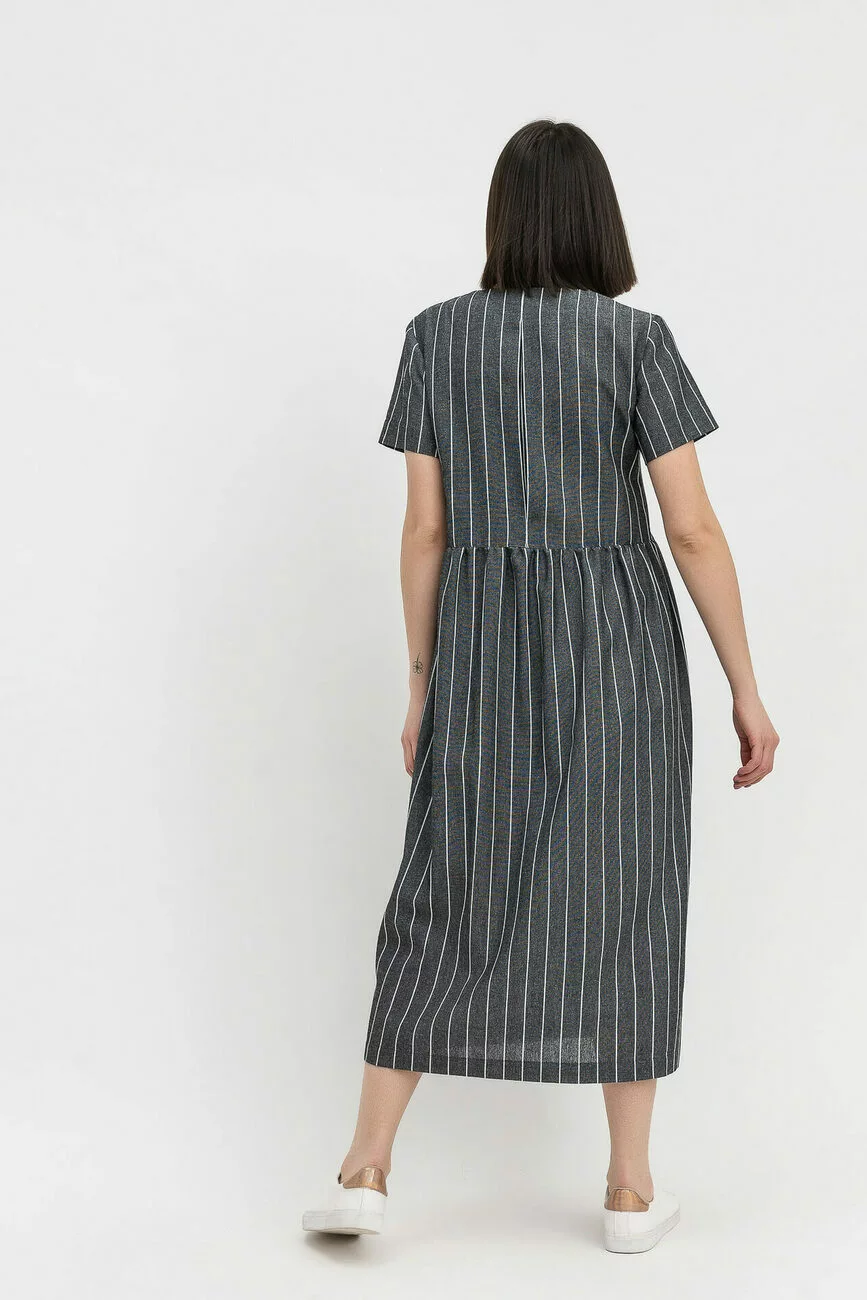 Виріб зшито з лляної тканини, яка вважається найкращим матеріалом для спекотних днів. Вертикальні смужки на тканині зорово витягують фігуру, роблять її стрункішою. Сукня має V-образний виріз горловини, короткі рукави та застібку попереду на ґудзиках. Ця стильна сукня стане незамінною у літньому гардеробі жінки!