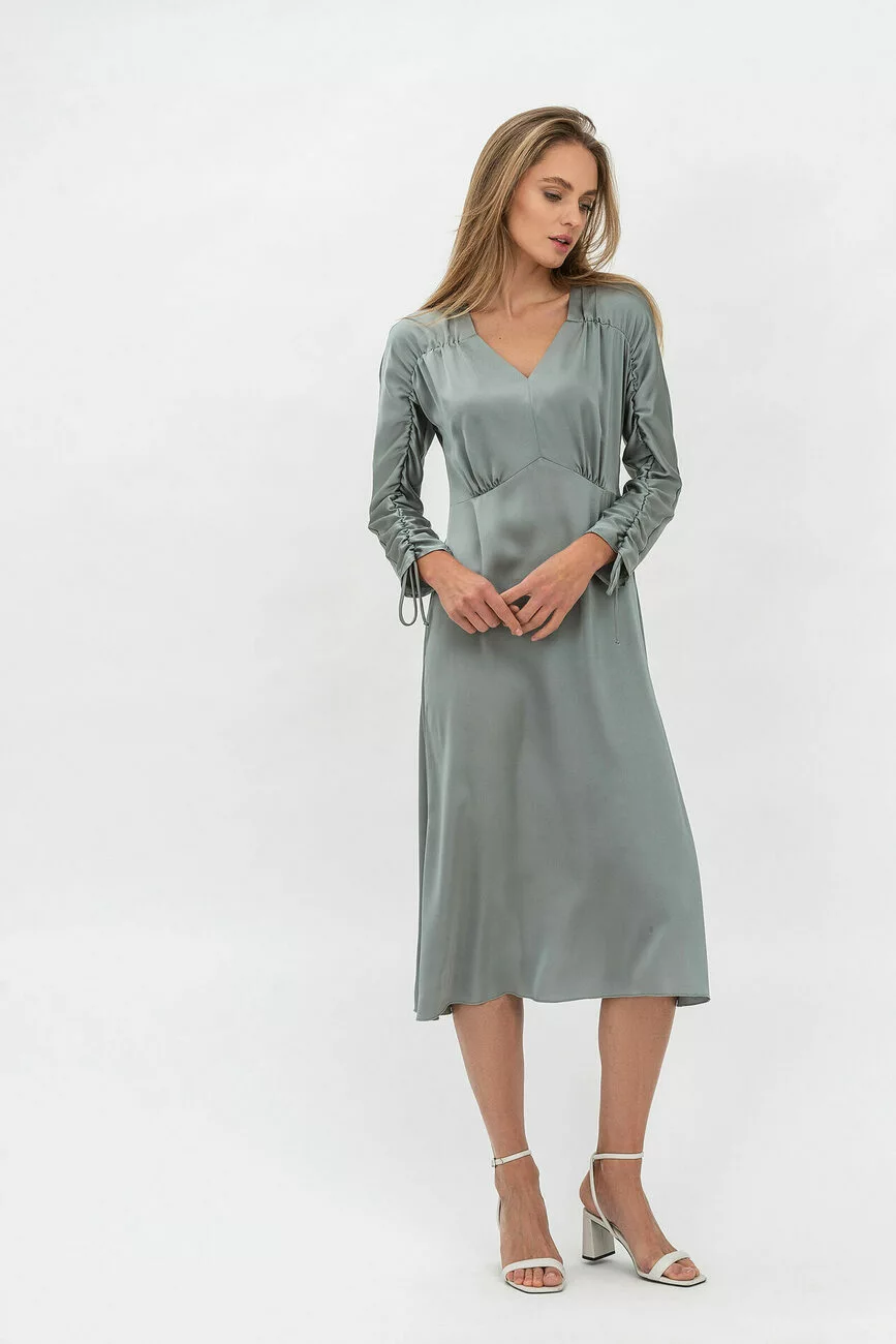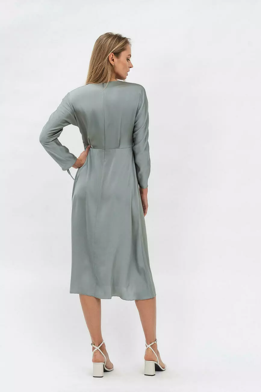 Минимализм – привлекателен, и это факт. Нежное платье из однотонного атласа тому прямое подтверждение. И это тот случай, когда элегантная женская одежда не требует совершенно никаких дополнений. Романтичная миди-длина, завышенная талия, цельнокроенный рукав со стяжкой по полочке и красивый, космический серо-серебристый оттенок. Заключительный бонус для тех, кто настроен купить такое платье – оно универсальное и актуальное вне трендов.