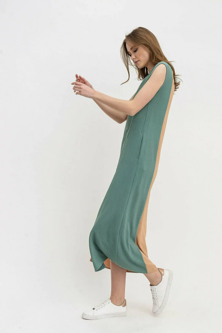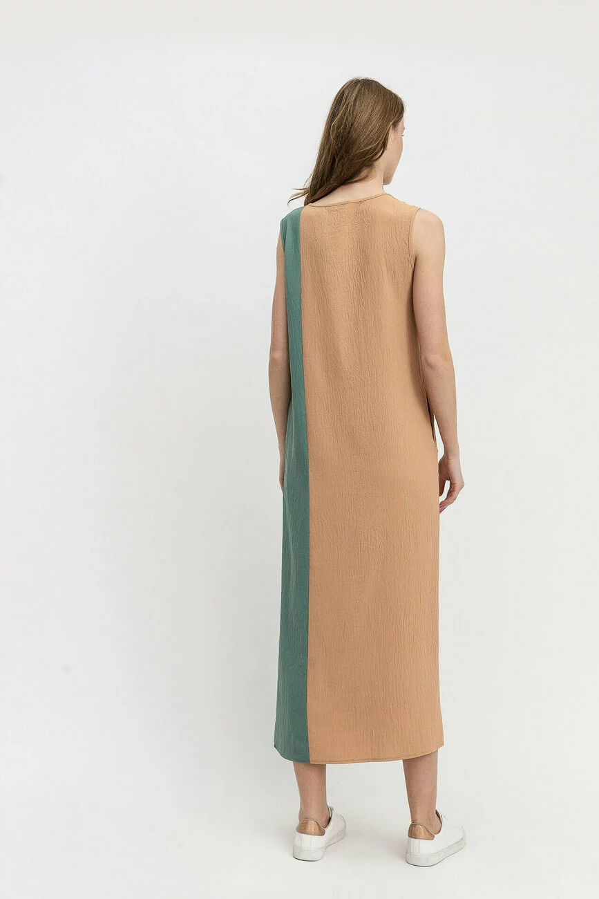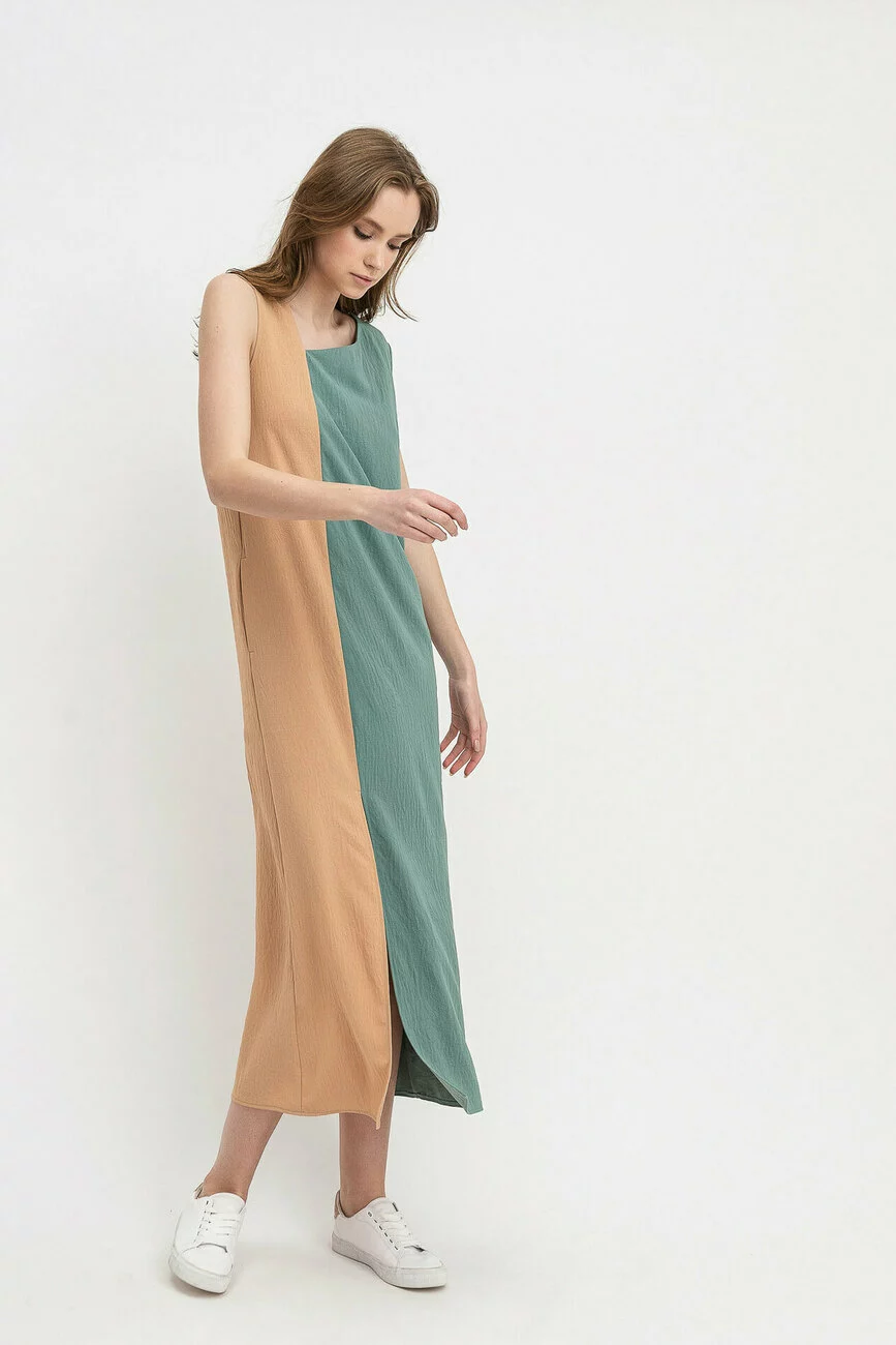 Модель має асиметричний крій та комбінується тканинами двох різних пастельних кольорів. Силует вільний, що дозволяє виробу добре сидіти на різних фігурах. У комплекті до нього йде пасок-шнурівка. Купити сукню в Україні ви можете в інтернет-магазині жіночого одягу бренду LESIA!